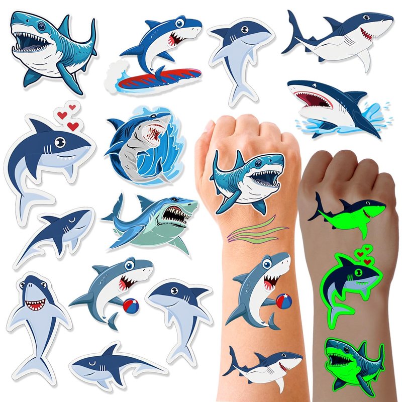 - Surprise Gift for Kids: No kids can refuse these cute shark tattoos! Luminous shark tattoos for kids. You can stick on various parts of the body, these fake tattoos can last for 3-5 days.