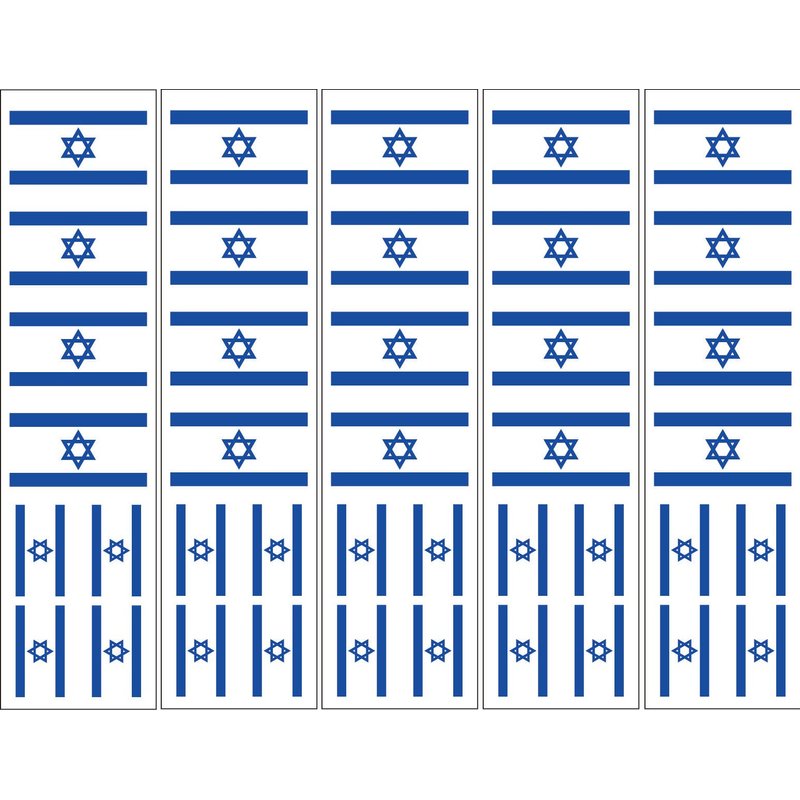 One order = 5 sheets. Each sheet features 8 Israel Flags (4 are 4.5 cm width, 4 are 3cm width) so you receive a total of 40 temporary tattoos. Rich colors last for days (depends on your skin). These are applied with water and are waterproof. Great for Israeli parties!