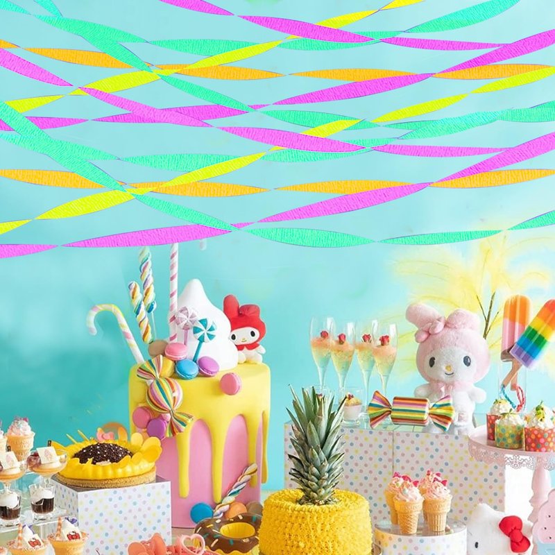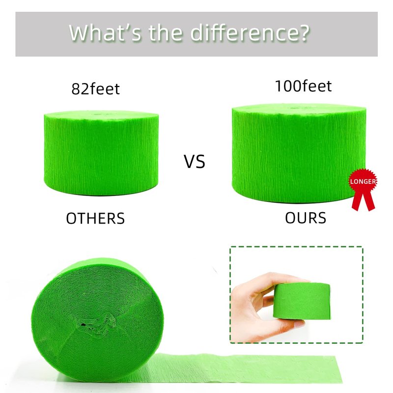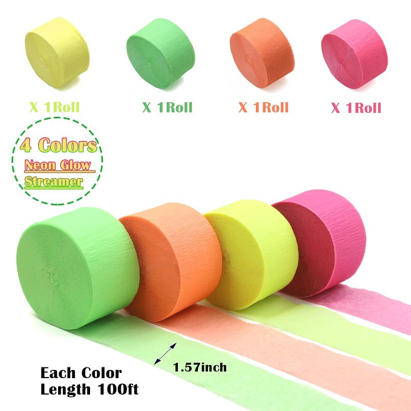 - 【GREAT VALUE】 4 Rolls Crepe paper streamers color in green, orange, yellow ,pink. 400 feet/Each roll measures approx. 1.6 inches in width and 100 ft in length. They can emit bright colors under normal light, but they glow under black light, exquisite decorations can make your party more attractive!