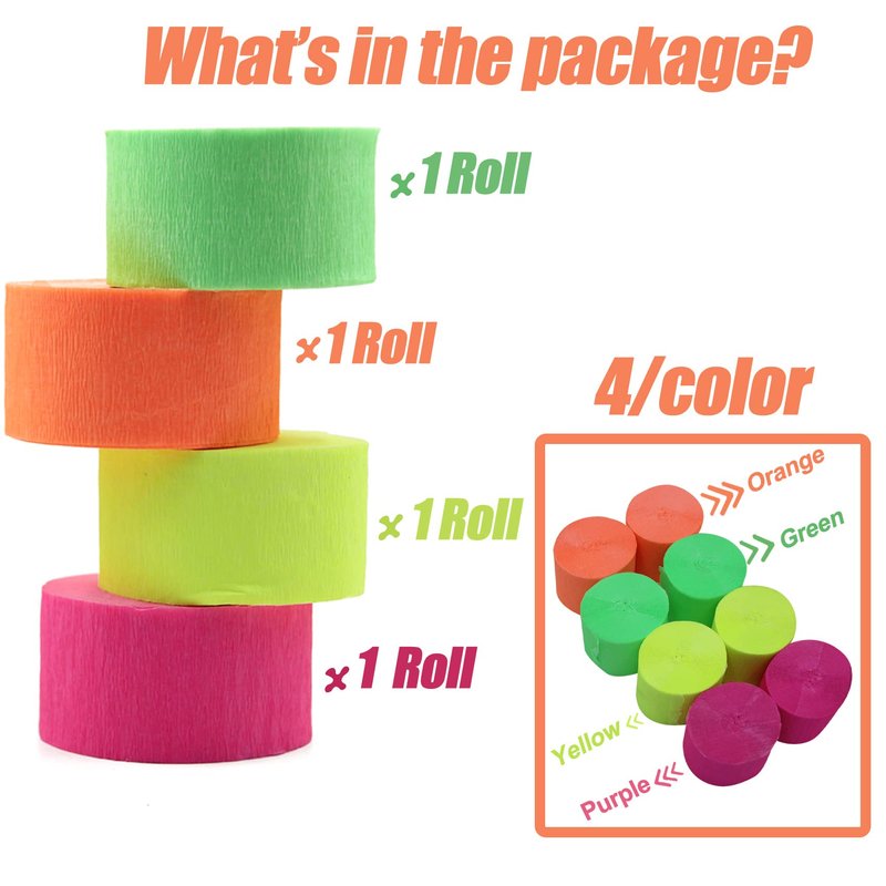 - Ideal Size and Bright Colors: Package contains 4 rolls of large sized crepe paper streamers in 4 colors of green, orange, yellow, pink. They are Neon Colors under normal light, but glow under black light. 400 feet/Each roll measures approx. 1.6 inches in width and 100 ft in length. Ideal Size for neon Party supplies