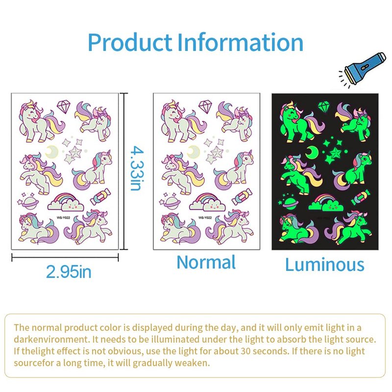 30 sheets of 400 kinds 4.3*2.95 inches for one set of temporary kids cartoon glow in the dark tattoos How to use your temporary tattoo? 1 Decide where you want to apply the tattoo.Make sure your skin clean and dry before application. 2 Cut the tattoo out as close to the edge as possible. 3 Remove the protective transparent sheet and place the design face down onto the desired area. 4 Wet the paper with the wet towel firmly or sponge and wait 30 seconds. 5 Carefully remove the tattoo paper to check if it has transferred,if not press little longer.Be sure not to twist or stretch the skin until the tattoo had time to set. How to remove: When removing the tattoo, you can use alcohol, baby oil or makeup remover, soak the temporary tattoo for a few minutes, and then gently wipe it until it is removed. Note: It is not suitable for sensitive skin or skin allergic to adhesives. If you feel unwell, please stop using temporary tattoos immediately. prompt: We recommend that you clean the place where you want to stick the tattoo to make it more realistic. If you lightly apply baby powder on the tattoo area with a makeup brush, the temporary tattoo will last longer. Avoid rubbing or scrubbing the tattoo area when taking a bath, otherwise the tattoo will fall off quickly, shortening the use time.