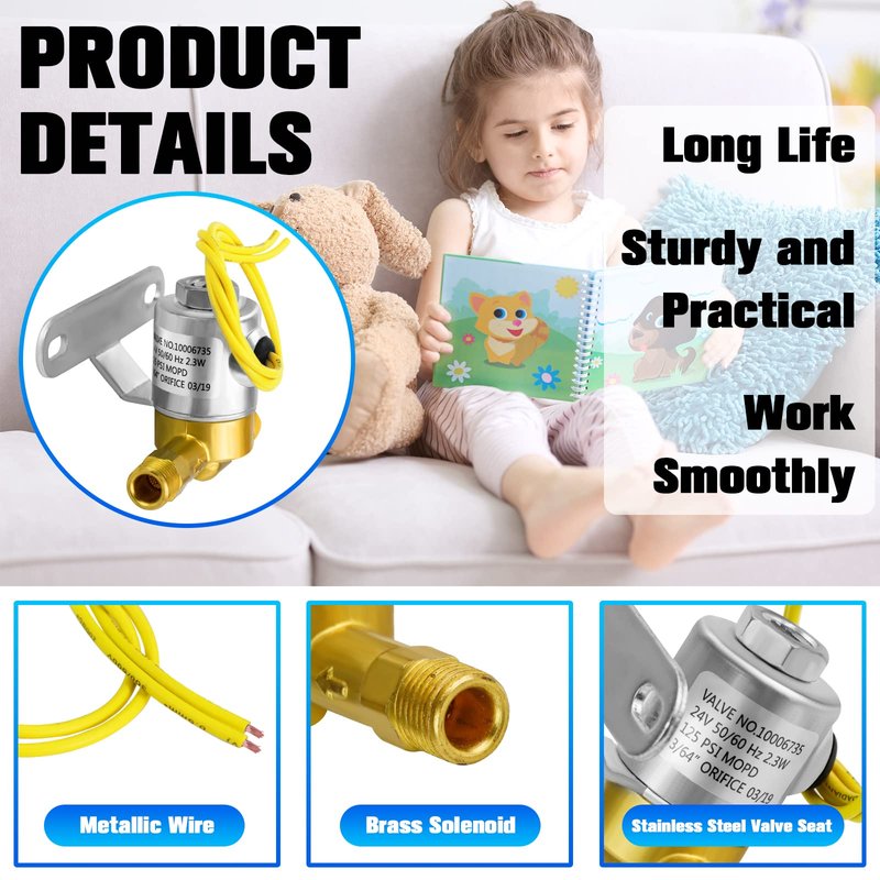 - PRODUCT SPECIFICATIONS - Our 4040 humidifier water solenoid valve can successfully complete the standard installation of your humidifier. Package includes the In-Line Strainer, Compression Sleeve, and Compression nut needed for repair. Specifications: 24 volts | 2.3 Watts | 60 Hz | Yellow. The solenoid valve smoothly switches the water in the humidifier and controls the amount of water flowing into the humidifier to ensure the humidity in your home is moderate