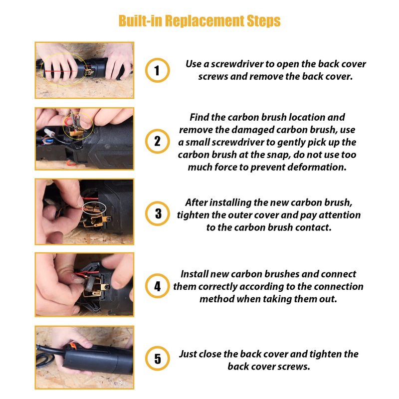 - 【Warm tip】:Worn brushes can cause the motor to smoke or spark and should be replaced if it occurs. When replacing carbon brushes, be sure to inspect your armature for burns, cracks, or other damage which can indicate larger motor problems that may not be solved by replacing the carbon brushes.After replacing new carbon brushes, if it doesn't take a few minutes or hours for the carbon brushes to wear out or wear in half, it means your rotor is bad. Please replace the rotor promptly.