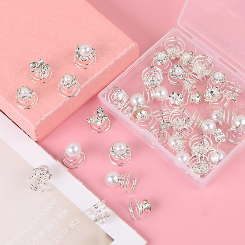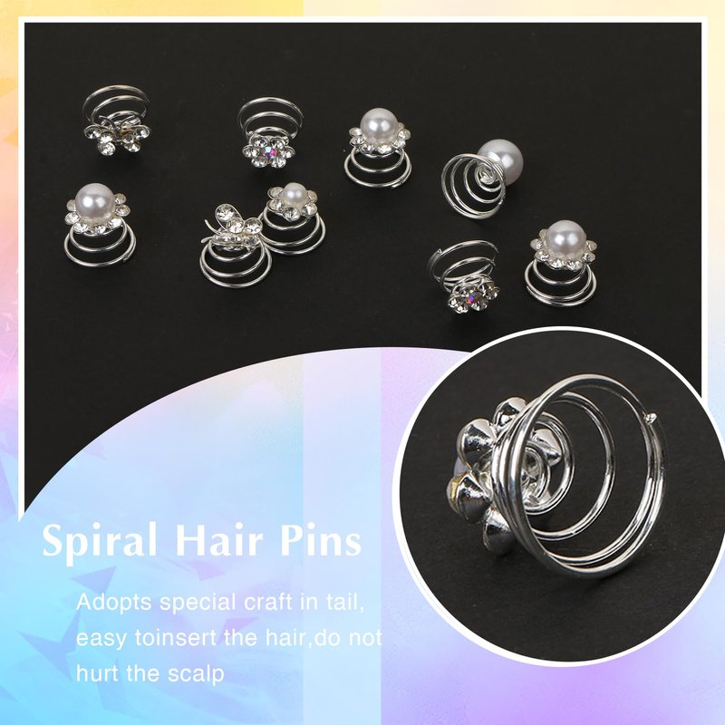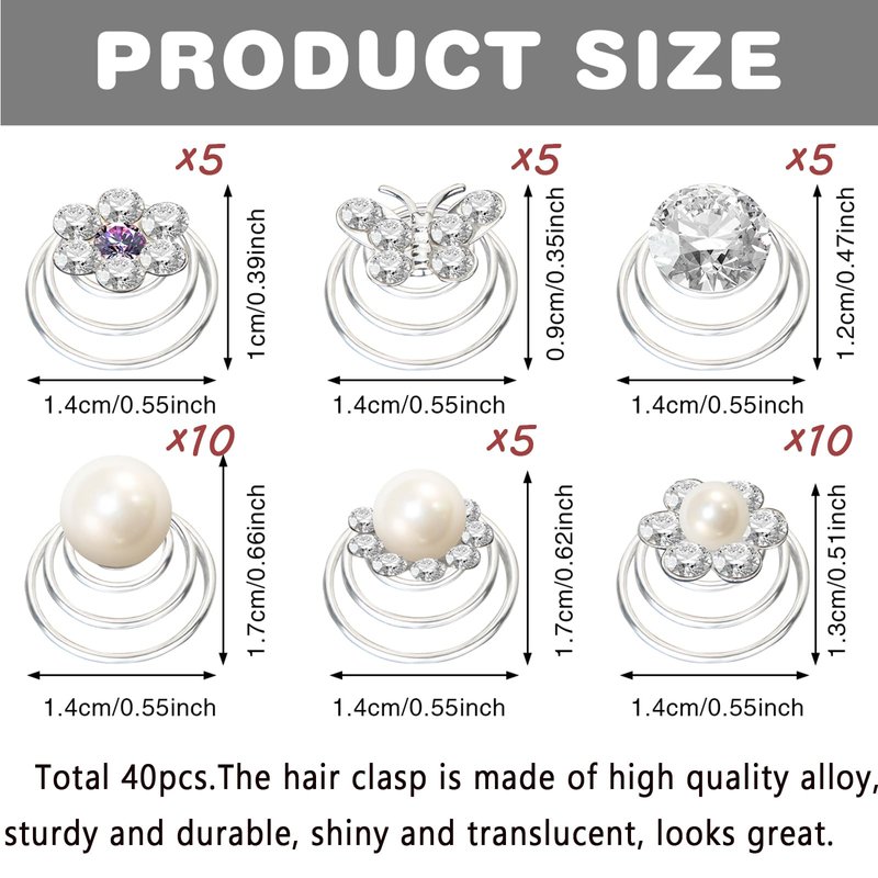 - Beautiful Hair Clips---40pcs spiral hair pins, 6 styles, inlaid with beautiful pearls and flowers, these bridal hair pins can be matched with different hair colors and hairstyles, they are great decorative hair pins for women and girls.