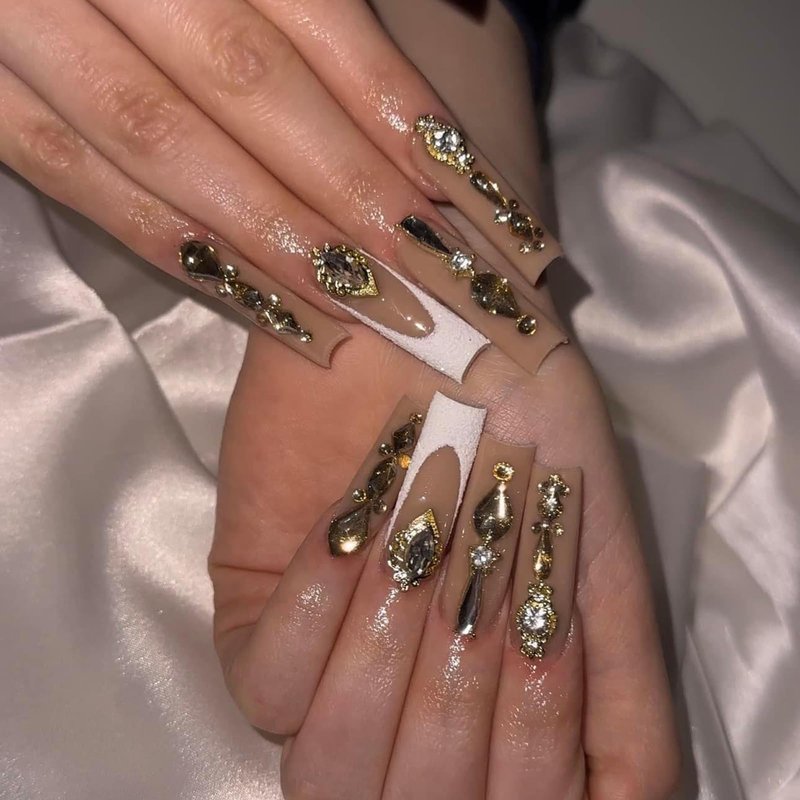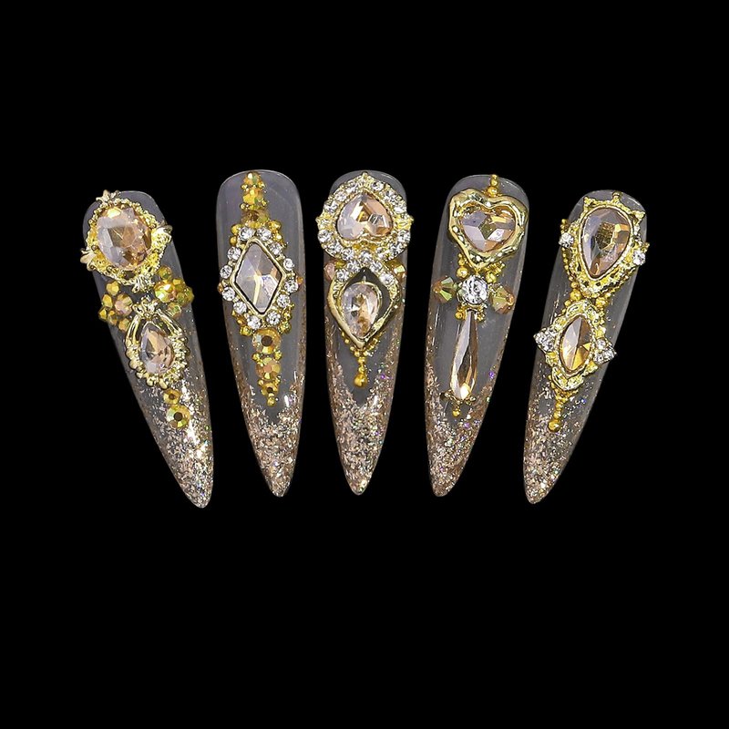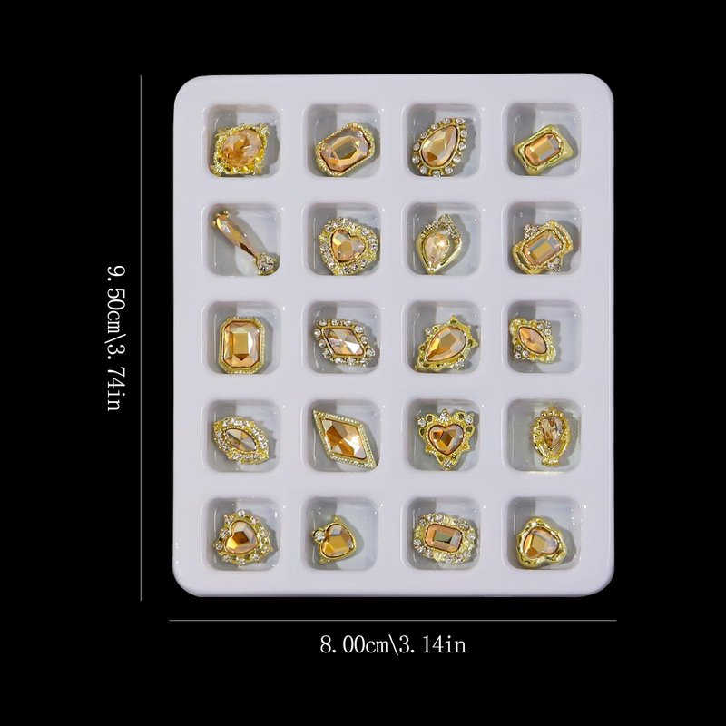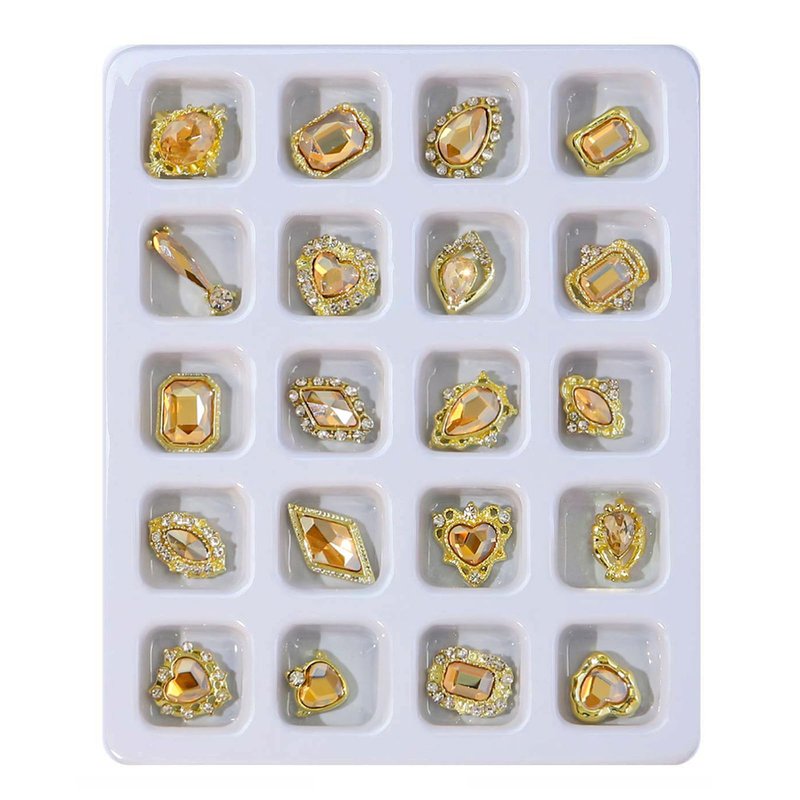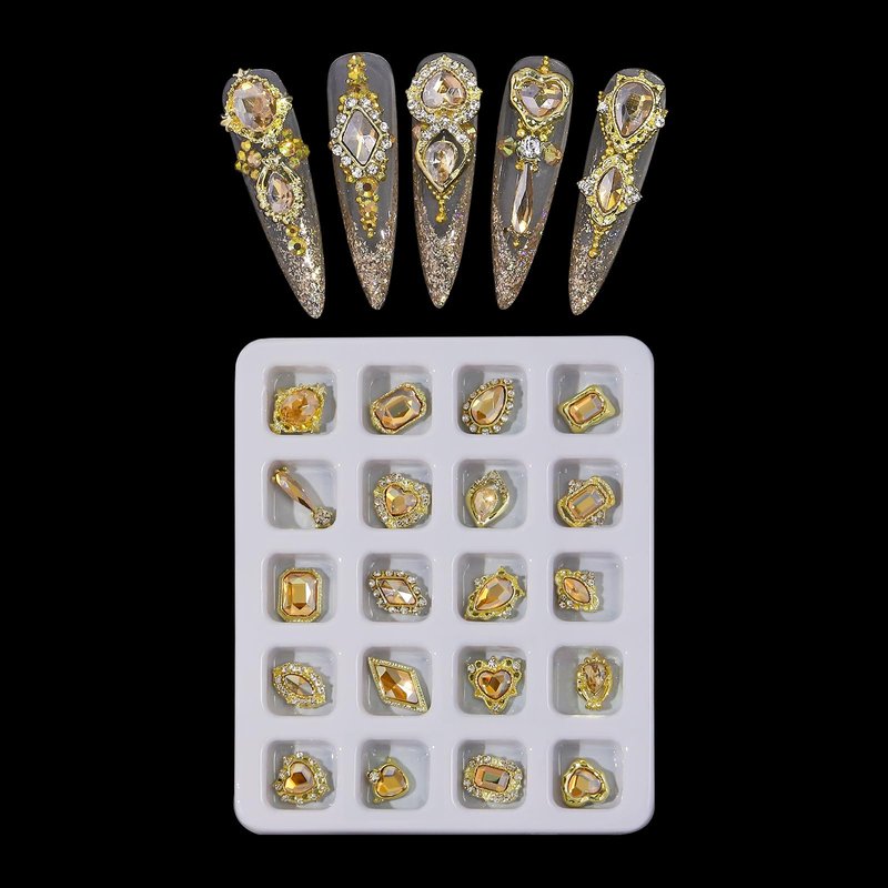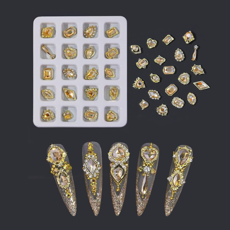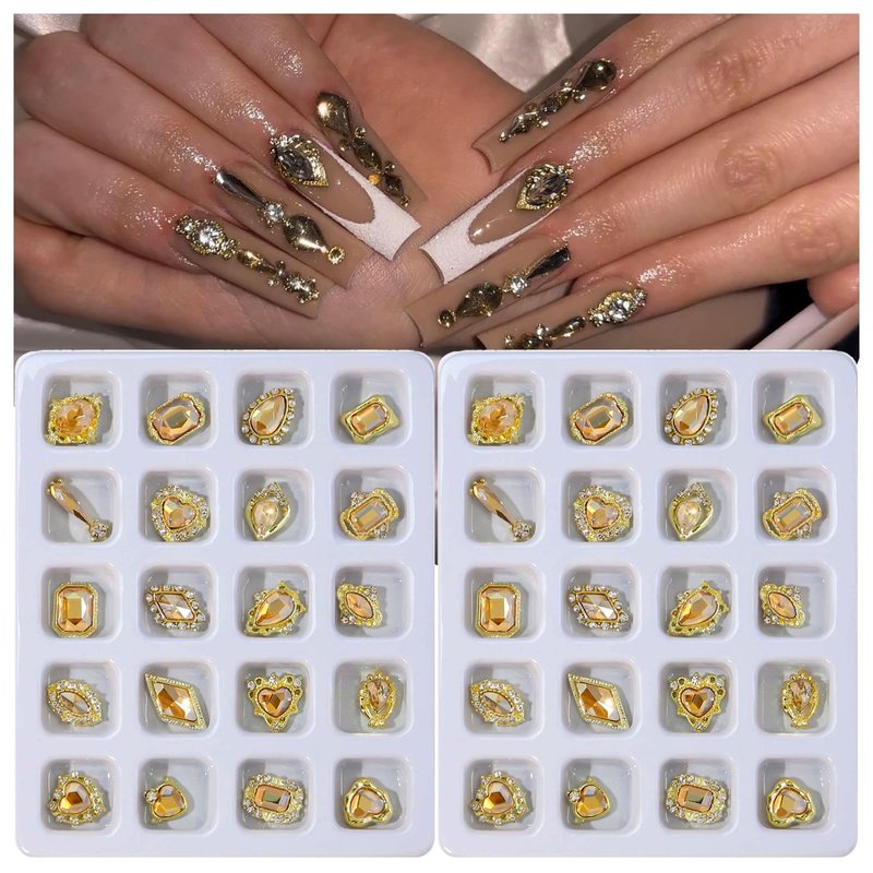 - ✔【2 BOXS LUXURY ALLOY NAIL RHINESTONES】This 3D Champagne Gold nail art diamonds nail charms kit are available in 20 different hot selling style, which add sparkle and glamour to your nail art, make your nails more dazzling and charming. The paired sets give your nails a symmetrical aesthetic