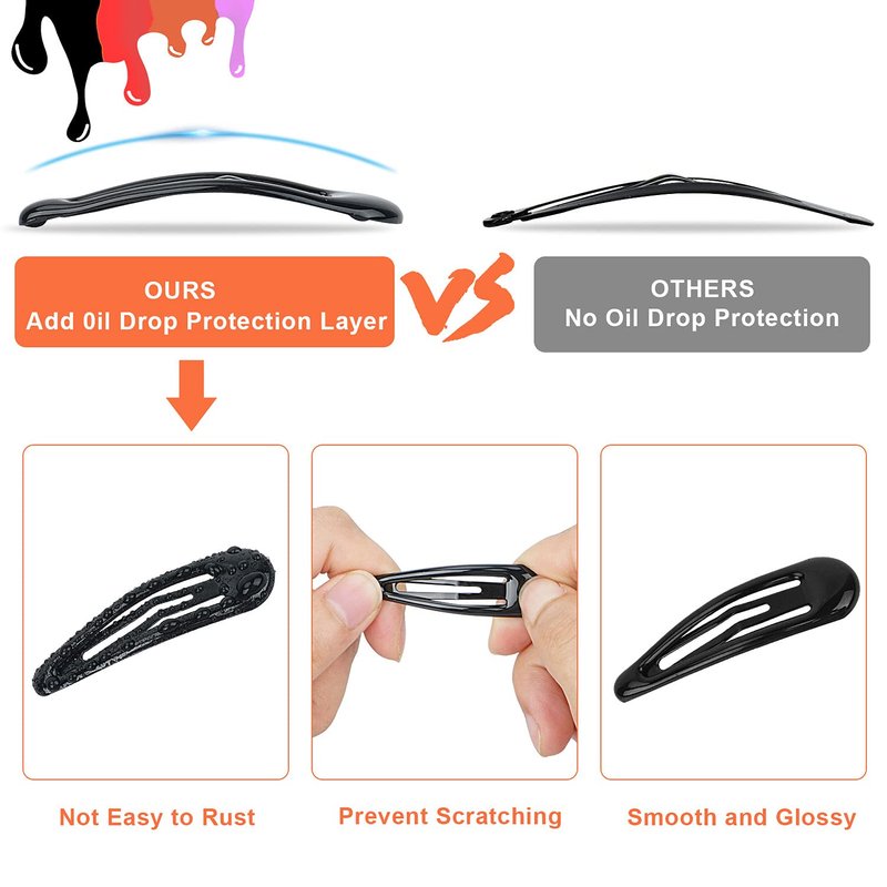 Thanks to the great dorp oil layer, our small hair clips for kids are vivid and smooth, not easy to rust or peel off paint. Also, the dorp oil coat can obviously prevent scratching and resit daily wear out, so that the hair clips can accompany with you for longer time.
