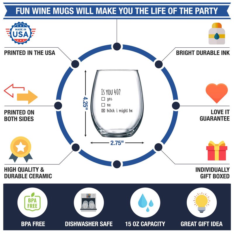 - UNIQUE GIFT FUN PARTY FAVORS AND DECORATIONS: This beautiful novelty wine glass is the perfect gift to WOW your guests and friends, whether it’s for a milestone 40th birthday party, class reunion or 40th wedding anniversary. Everyone will be thrilled to drink their favorite wine in this limited edition wine glass for years to come. Buy them in sets of 2, 4, 6, 12 or even more to make your next event truly memorable.