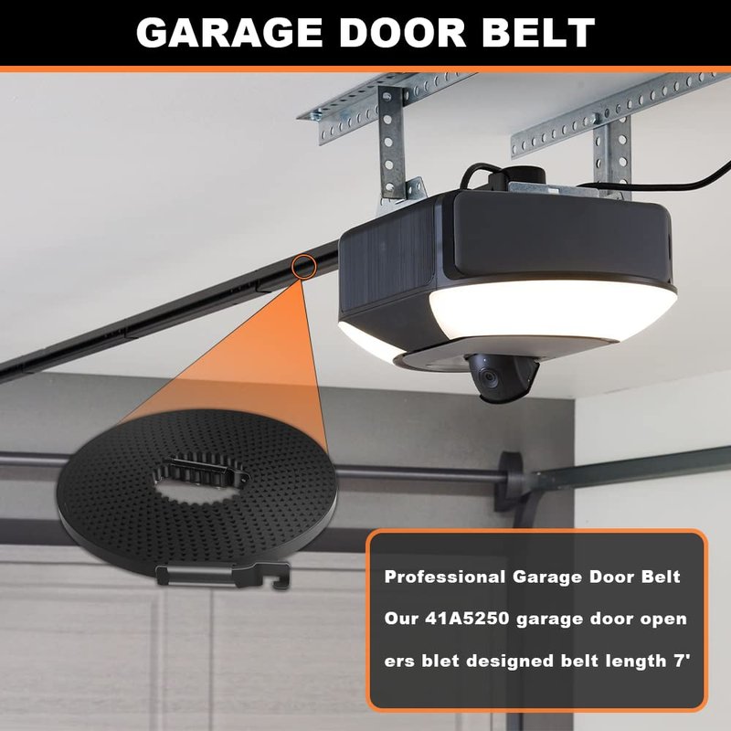 - 41A5250 GARAGE DOOR OPENERS BELT REJECTS NOISE: New Garage Door Belt (For Standard 7-Foot-High Garage Doors), Our Garage Door Opener Belt Is Designed To A Higher Standard So That They Are Much Quieter. Homeowners With A Bedroom Or Other Quiet Room Adjacent To The Garage Would Appreciate Our Belt-Drive Garage Door Opener Belt. Let Your Family And Neighbors Enjoy A Quiet And Relaxing Life. Tip: Length 237 Inches