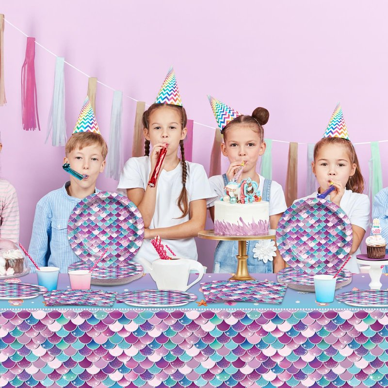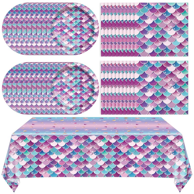 - Reliable material:The mermaid themed party tableware set are made of paperwhile the tablecloth is fashioned from plastic that resists breakage and deformation. The durable nature of this party's tableware ensures it will withstand even the most raucous celebrations. And when all is said and done, these disposable items can be easily discarded, saving you precious time.