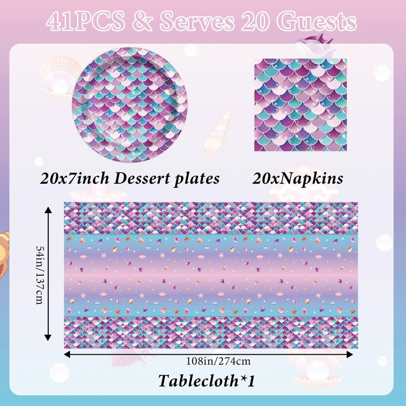 41PCS Mermaid Themed Party Decorations Set Party Tableware Includes 20 Party Plates 20 Napkins and 1 Tablecloth for Mermaid Birthday Party Supplies Favors Girls Kids