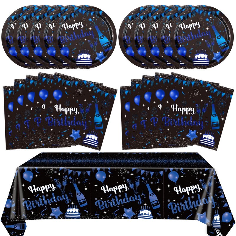 - Happy Birthday Party Supplies: Our blue and black birthday decorations includes 20 pieces happy birthday plates, 20 pieces happy birthday napkins, 1 pieces happy birthday tablecloth. Happy birthday decorations will give you a perfect birthday party memory.