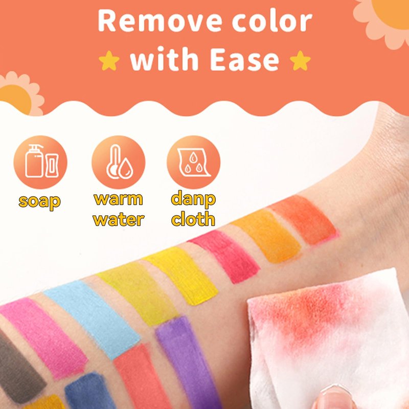 - Easy to Use and Wash Off:Our Face Paints Are Water Activated and Dries Fast With Extremely Pigmented,Provide Long Lasting,Smooth and Excellent Coverage,Less Prone to Fading or Cracking.Different From Cleaning Wax-Based or Oil-Based Painting,You Can Easy Wash Off With Soap and Water or Wet Wipes.