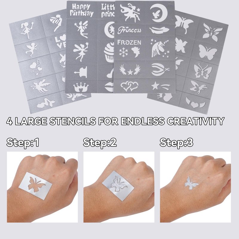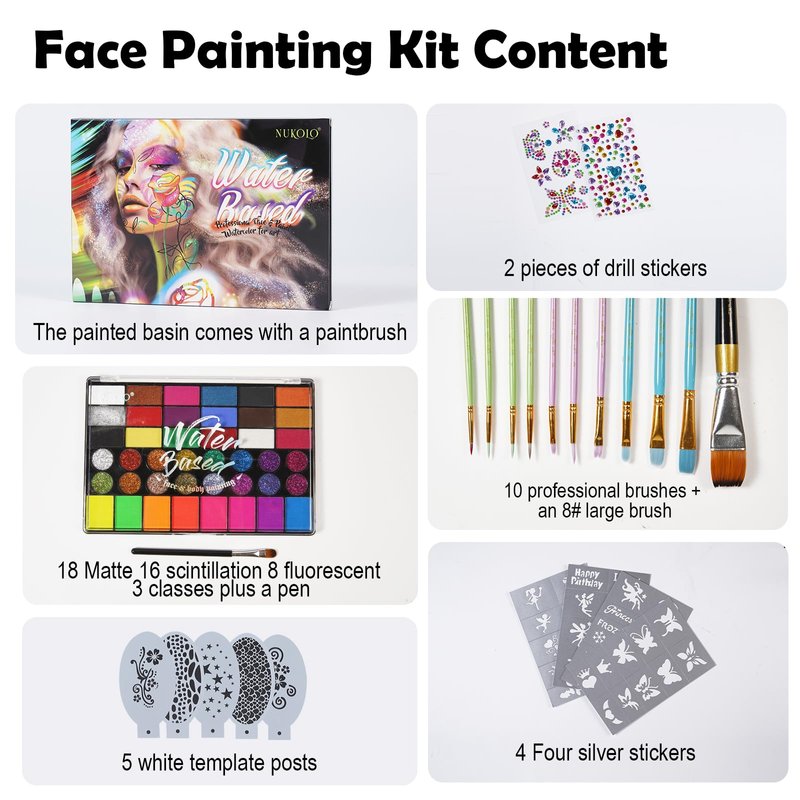 - All-Inclusive Kit:Our Face Paint Kits Includes: 18 Matte Colors/16 Glitter Colors/8 Fluorescent Colors of Children's Non-Toxic Face Painting Pigments, 11 Brushes, 1 8# Wide-head Brush, 4 disposable stickers, 5 reusable professional templates,, 2 Diamond Stickers,Can Meet Your More Painting Needs add more unique decorative effects.