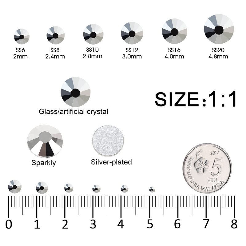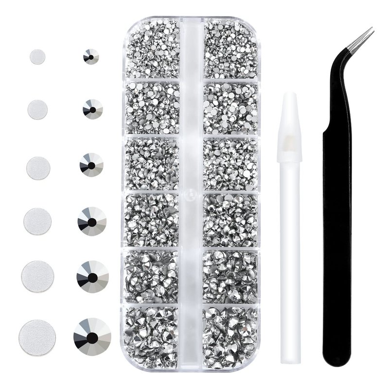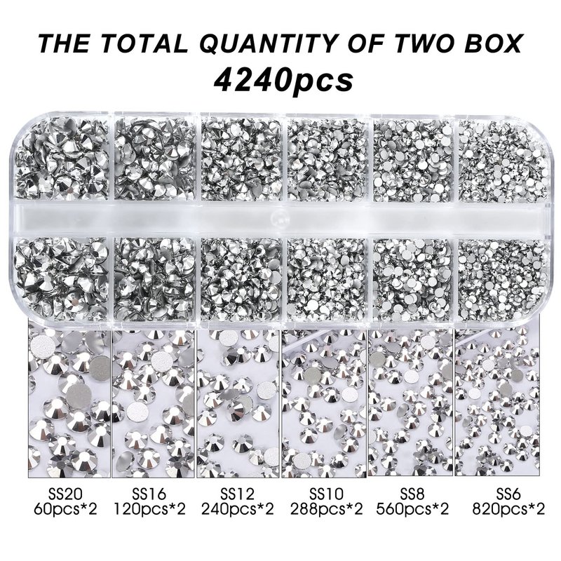 Product Packaging: Box Packaging SS6 2MM - 1680 Pcs SS8 2.4MM - 1120 Pcs SS10 2.8MM - 600 Pcs SS12 3MM - 480 Pcs SS16 4MM - 240 Pcs SS20 4.8MM - 120 Pcs 1 pcs Tweezers and 1 pcs Picking Pen Material: Glass/Artificial Crystal. Surface High-precision cross-section, multi-sided cutting, high brightness,high Sparkly. Flatback, Round,Silver-plated back, not easy to be allergic. The color runs through the rhinestones without fading. You can use rhinestones for, Nails, Art, Jewels, Skin, teeth, face, eye, Makeup, tumbler, glass, crafts, cardstock, phone, phone case, plastic, glasses etc. If you are using shoes, clothing, fabric textile type, I suggest you search on Amazon: B09ZQKTW4V Use tweezers and Picking Pen gem picker to pick rhinestones, There is no glue on the bottom, additional nail gel is required, or other professional glue for makeup or nails. Can use E6000 super glue to fix on crafts, art decoration. not hotfix.