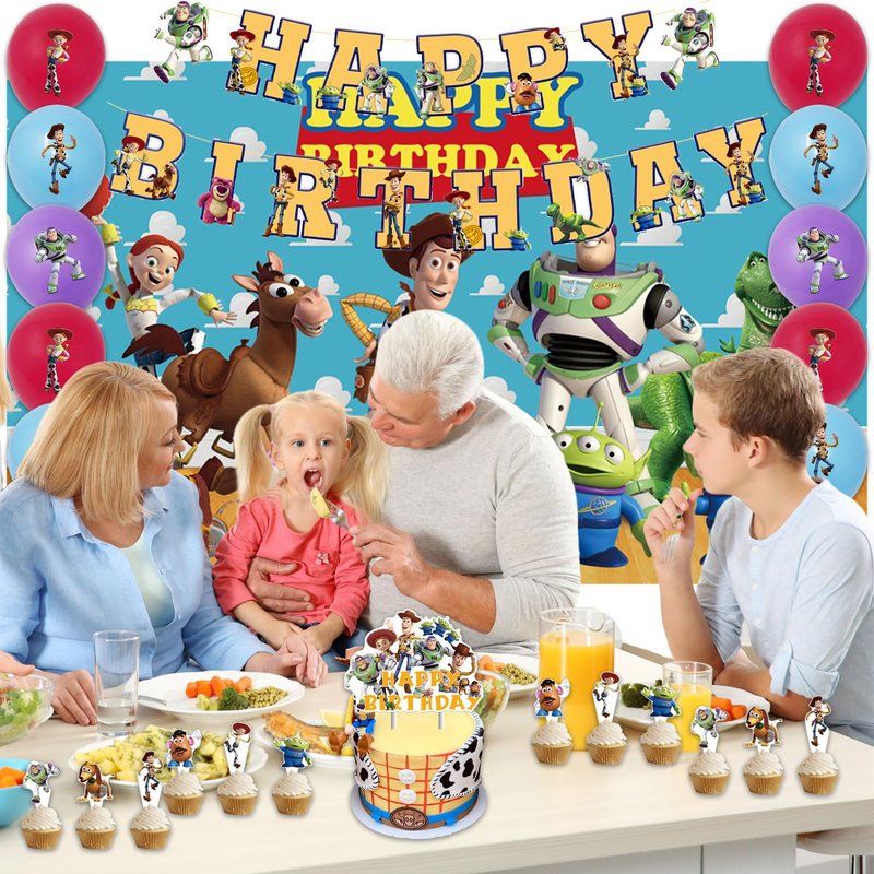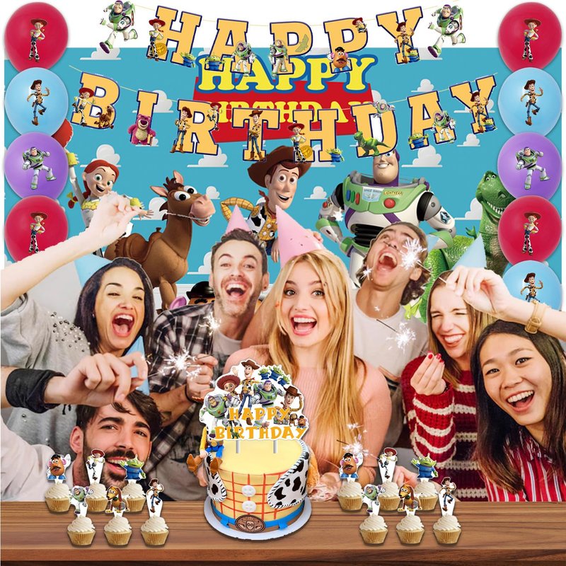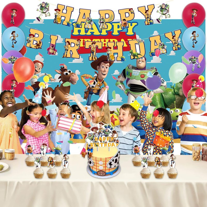 - The Toy Birthday Party Supplies pack set coming include cute banner 1pcs,high quality 24pcs cupcake stick,,1 cake topper,1 Blackdrop,15 Balloons