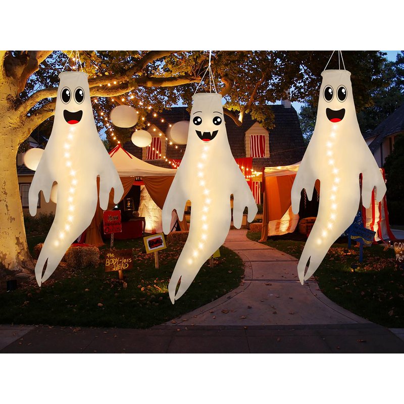 - Package includes Three Halloween ghost hanging windsocks,and each ghost decor with the string of light (each with swivel hanging clip).