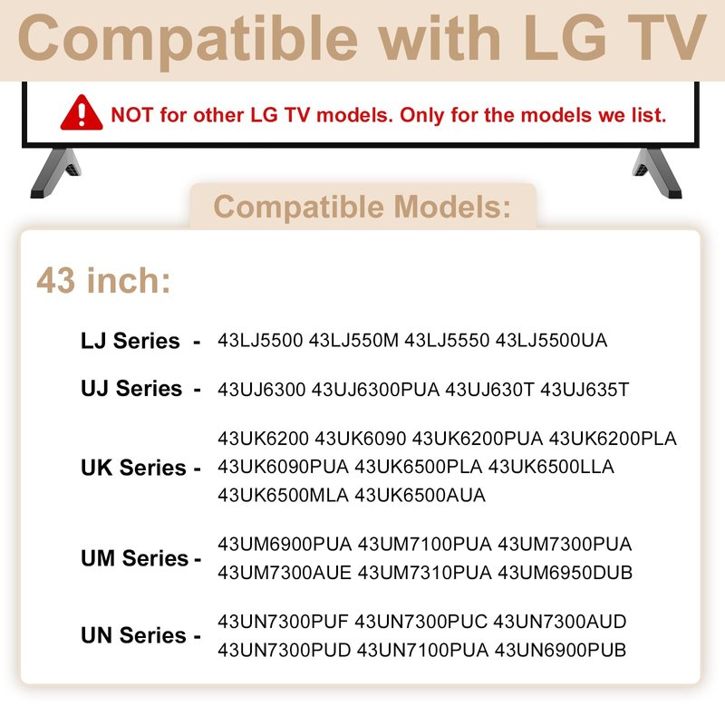 - Compatible Models: Replacement legs for LG TV stand replacement base. For LG 43 inch TV legs 43LJ5500 43LJ550M 43LJ5550 43LJ5500UA 43UJ6300 43UJ6300PUA 43UJ630T 43UJ635T 43UK6200 43UK6090 43UK6200PUA 43UK6200PLA 43UK6090PUA 43UK6500PLA 43UK6500LLA 43UK6500MLA 43UK6500AUA 43UM6900PUA 43UM7100PUA 43UM7300PUA 43UM7300AUE 43UM7310PUA 43UM6950DUB 43UN7300PUF 43UN7300PUC 43UN7300AUD 43UN7300PUD 43UN7100PUA 43UN6900PUB 43UN6950ZUA 43UN6951ZUA. (⚠ Important Notes: Only for the models we list.)