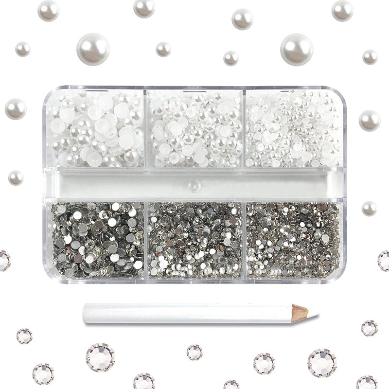 4300 Nail Rhinestones - Rhinestones & Pearls, Multi Size Shiny Rhinestone Pearls for Nail Art (White Pearls+White Rhinestones)