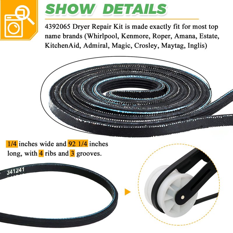 - ✅【 4392065 DRYER REPAIR KIT】►4392065 Dryer Maintenance Kit for 29 wide dryers with the lint filter located on the top of the dryer. ►691366 Dryer Idler Pulley keeps tension on the dryer drum belt. ►Ken-more 8066065 Dryer Belt 341241 is 92 1/4" long, 1/4" wide, 4 ribs, 3 grooves. Replaces some wider 5 rib belts. ►Drum support roller kit 349241T holds the drum in place while the drum rotates on the support wheels. Each one has been strict testing by manufacturer before leaving the factory