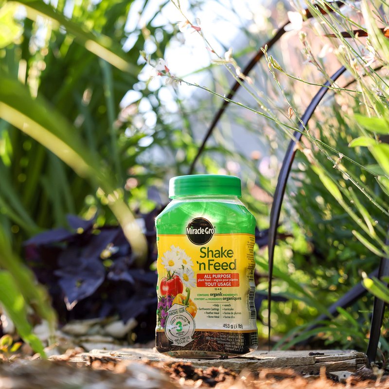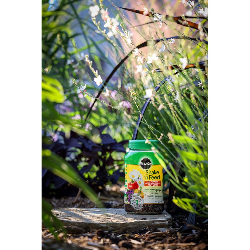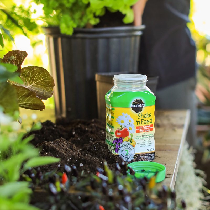 Plants do a lot of good things, including delighting us and beautifying our surroundings. So, plants deserve good things in return – like Miracle-Gro Shake ’n Feed All Purpose plant food. This unique plant food nourishes plants to help them grow stronger, vibrant, and more productive. Contains organic ingredients, including kelp, earthworm castings, feather meal, and bone meal. Naturally occurring microbes in the soil break down these organic ingredients into nutrients plants can use. That means plants get nourished above and below the soil, which supports root strength and root development. Shake Miracle-Gro Shake ’n Feed All Purpose plant food just about anywhere, including in-ground and container plants. Feeds for up to 3 months.