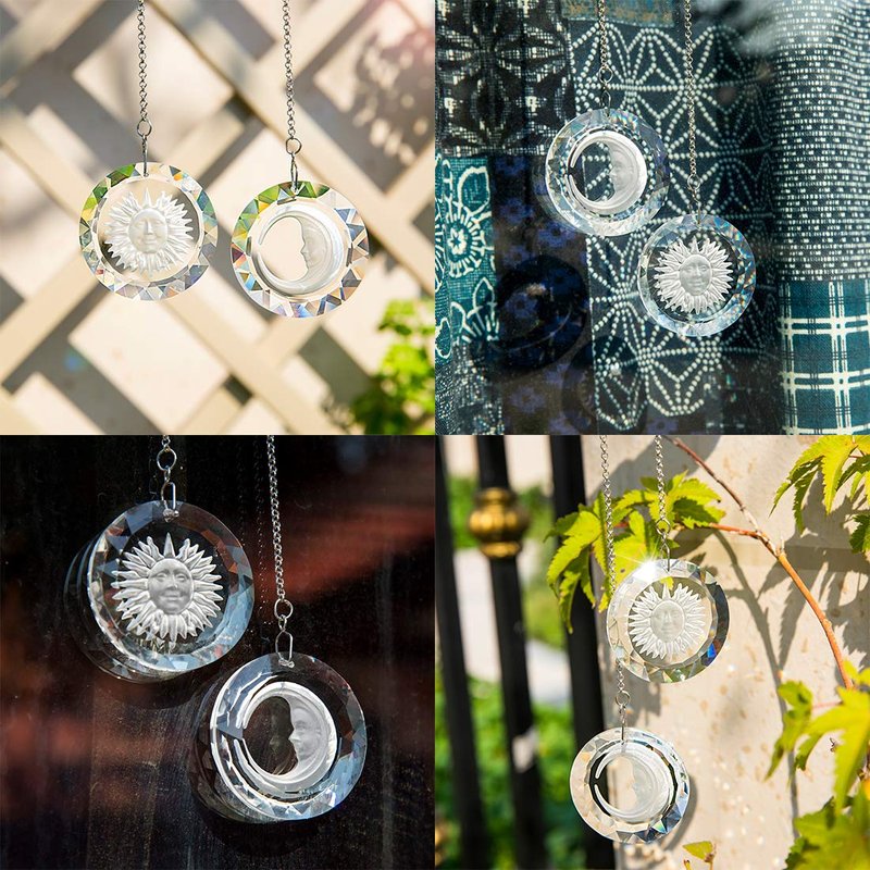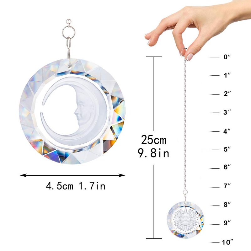 - 🌞🌛Show Details: The crystal prism suncatcher that will reflect pretty light under the illumination of sun,it has two type half moon and sun,they decor you home.It was 2 pack.