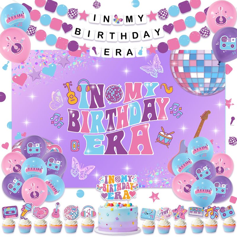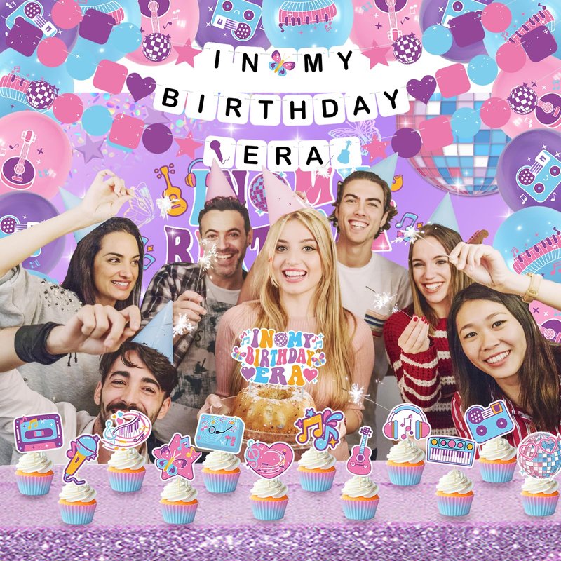 - 【What You Will Get】: Our In My Birthday Era party decoration set includes 1pcs happy birthday banner, 1pcs backdrop, 1pcs cake topper, 12pcs cupcake toppers,18pcs latex balloons.
