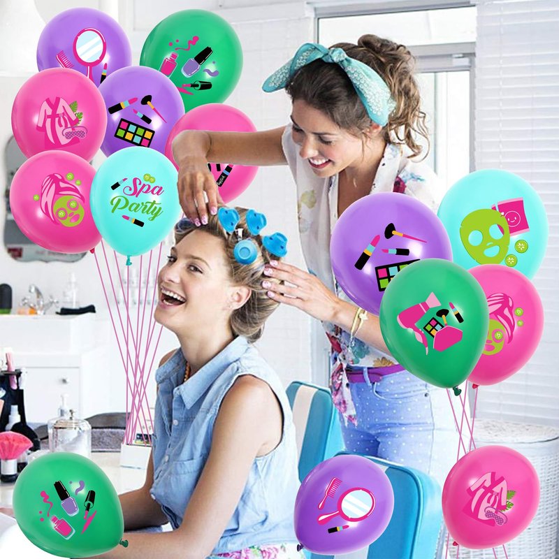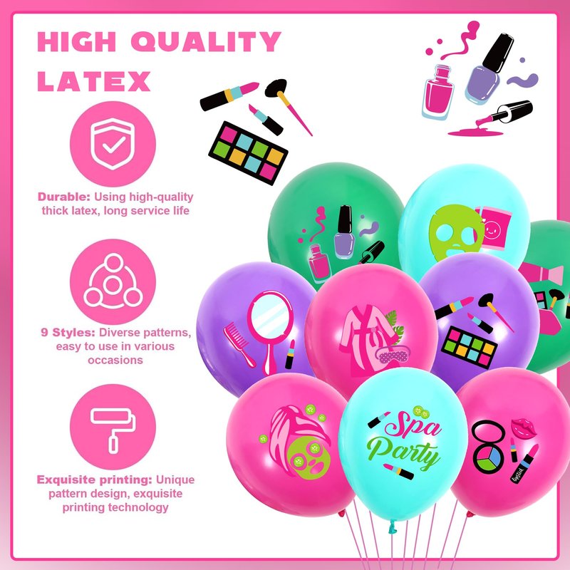 - Easy to Use: These colorful cosmetics party latex balloons can be inflated using an air pump or helium. When tied tightly, they will stay inflated longer, making them ideal decorations for your home during spa-themed events. Please do not overfill the balloon, 85% is enough