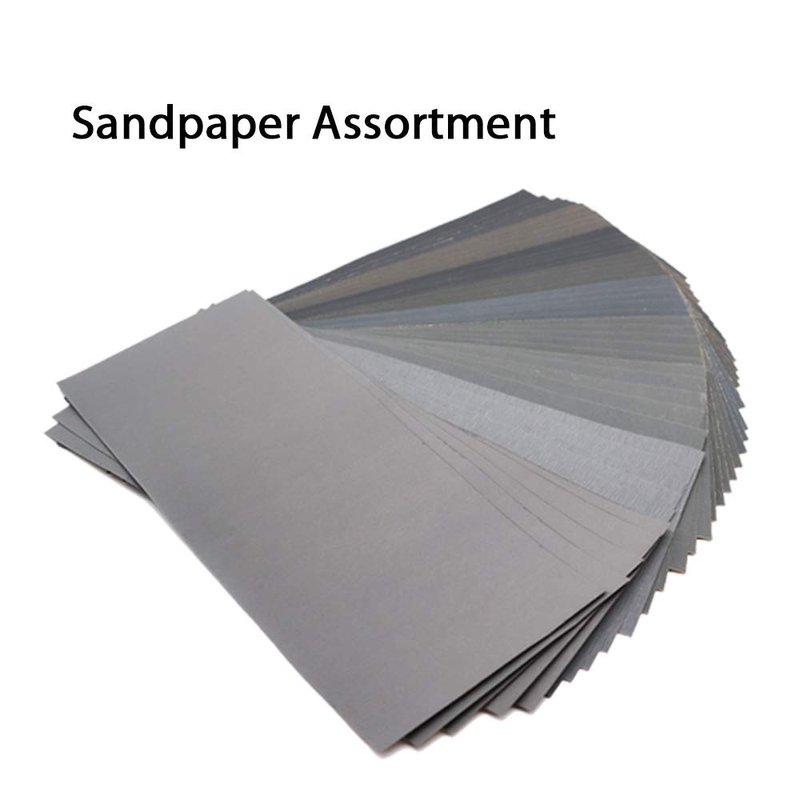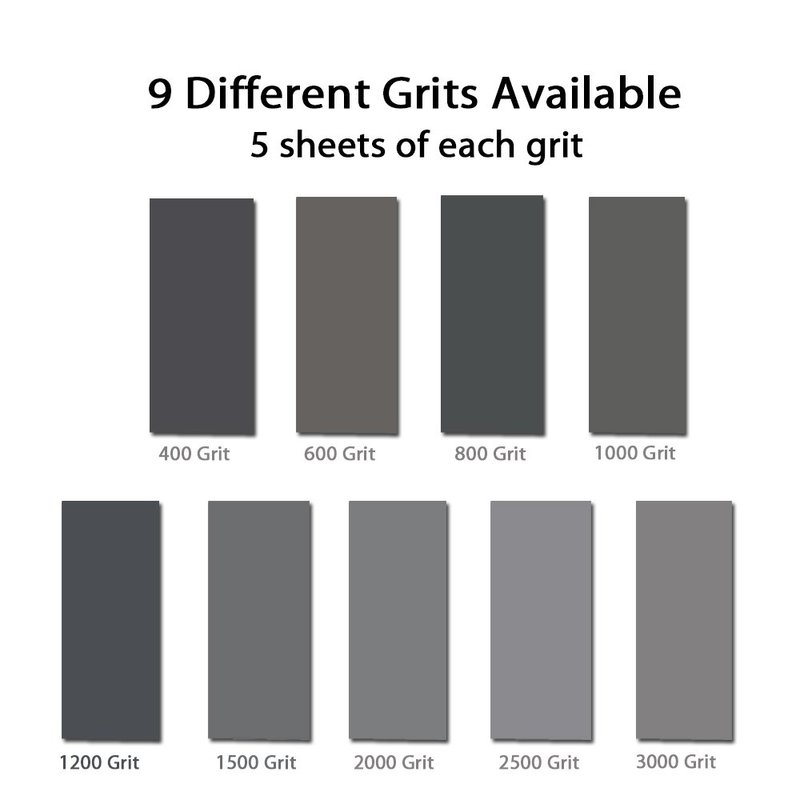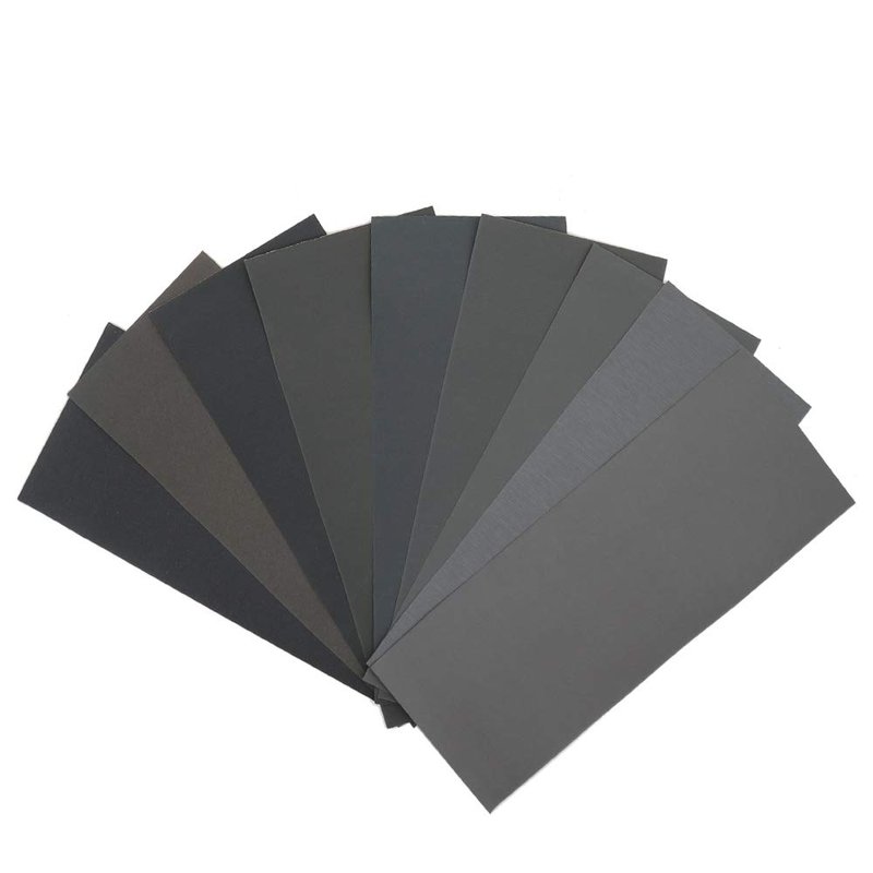 Great selection of varying grits: 9 different grits available, 5 sheets of each grit, 400/ 600/ 800/ 1000/ 1200/ 1500/ 2000/ 2500/ 3000, total 45 sheets.