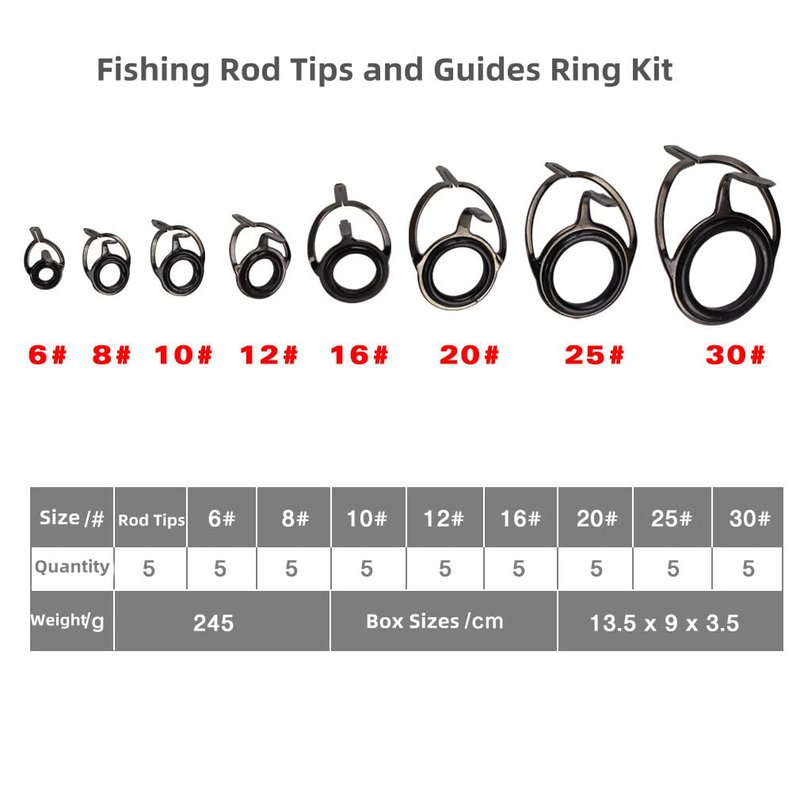 - 45pcs fishing rod tips and guides in different sizes. Material: Stainless Steel& ceramic