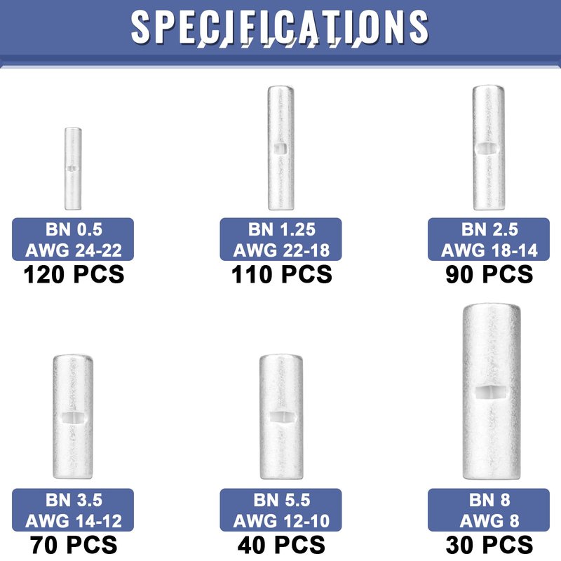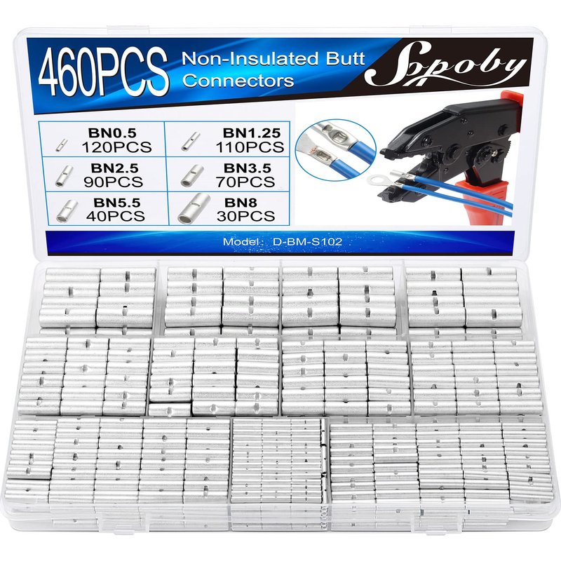 - ♥ GREAT ASSORTMENT: This versatile kit includes 460pcs uninsulated butt splice connectors for 24 to 8 gauge wires. Applied in auto, ship, DIY, etc.