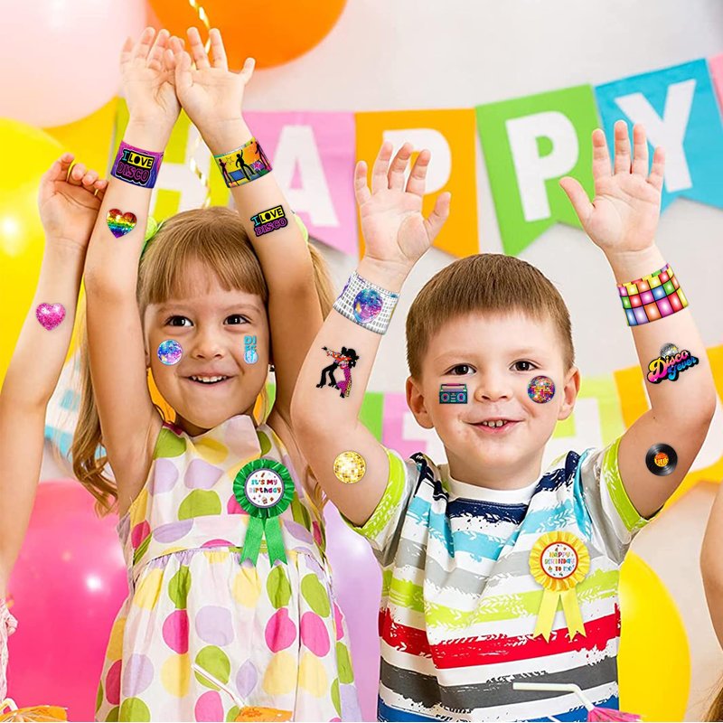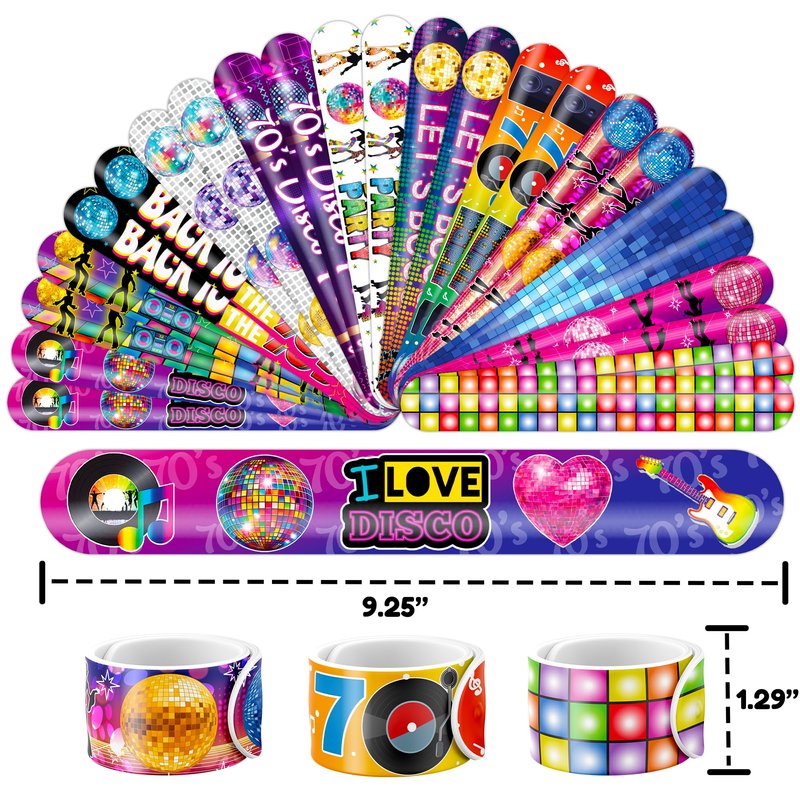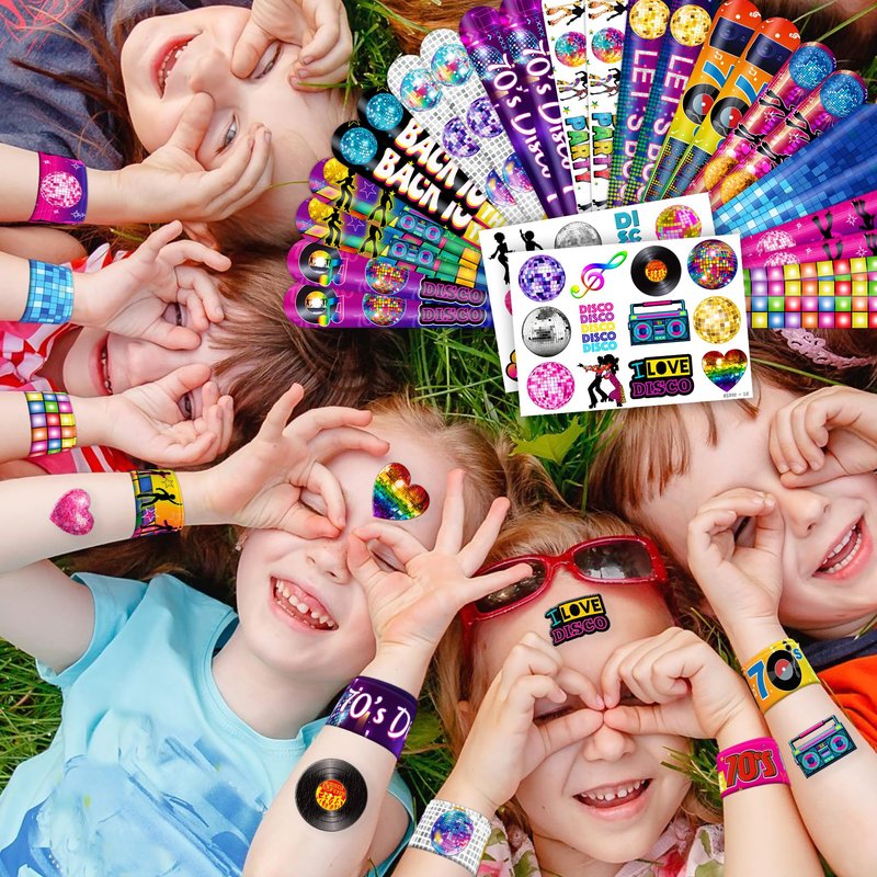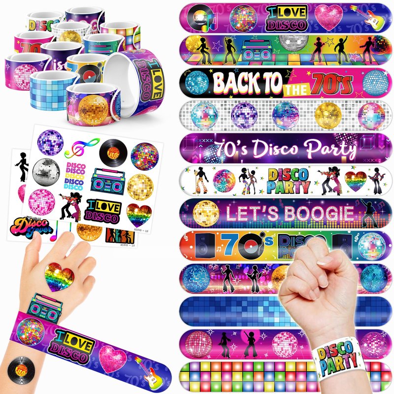- šćPERFECT GIFT FOR 70s DISCO ENTHUSIASTSć: Our 70s Disco Temporary Tattoos and Slap Bracelets are the perfect gift for people of all ages, from kids to adults. Suitable for any occasion, they offer an affordable and delightful option. Whether for school events, birthdays, or stocking stuffers, this 70s Disco themed collection adds a fashionable and nostalgic element to anyone's accessory collection, invoking happiness and cherished memories.