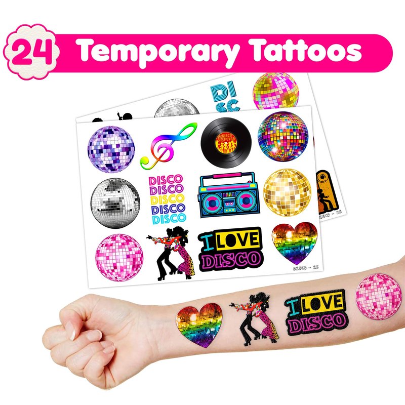 š„³ćDELIGHTFUL 70s DISCO PARTY FAVORS BUNDLEć: Get ready for laughter with our set of 24 temporary tattoo stickers and 24 slap bracelets. Each piece showcases vibrant and adorable designs inspired by the 70s Disco theme. Perfect for both kids and adults, this bundle ensures endless fun. The bracelets measure 23.5cm x 3.3cm, providing a satisfying "slapping" experience as they effortlessly wrap around your wrist. šæćDURABLE AND COMFORTABLEć: Constructed from high-quality materials, our slap bracelets are built to withstand wear and tear. The sturdy metal core is encased in soft PVC, ensuring safety, comfort, and longevity. With a smooth surface and no sharp edges, these bracelets offer a gentle and enjoyable feeling on your skin. Designed for daily use, they maintain their vivid colors and shape, adding a charming and nostalgic touch to your accessory collection. šćEFFORTLESSLY STYLISHć: Embrace the simplicity and trendiness of wearing our slap bracelets. With just a gentle "slap," they wrap around your wrist effortlessly, creating a comfortable and stylish look. Lightweight and comfortable for extended wear, they're perfect for parties, special occasions, or everyday fashion. These accessories bring a playful charm to any gathering, capturing the joyful spirit of the 70s Disco theme. Let the festivities begin! šæćVERSATILE AND PORTABLEć: Take the fun with you wherever you go with our versatile slap bracelets. Their compact and lightweight design allows for easy carrying in your pocket, purse, or backpack. Whether at school, work, or social gatherings, wearing them instantly adds a lively and fashionable touch to your outfit. With their playful and nostalgic appeal, these bracelets are sure to attract attention and bring smiles wherever you venture. Get ready! šćPERFECT GIFT FOR 70s DISCO ENTHUSIASTSć: Our 70s Disco Temporary Tattoos and Slap Bracelets are the perfect gift for people of all ages, from kids to adults. Suitable for any occasion, they offer an affordable and delightful option. Whether for school events, birthdays, or stocking stuffers, this 70s Disco themed collection adds a fashionable and nostalgic element to anyone's accessory collection, invoking happiness and cherished memories. * About tattoo: This product is not recommended for individuals with sensitive skin. We advise testing the product on a small patch of skin, such as the hand, to check for any allergic reactions to the ingredients before applying it to other areas of the body.