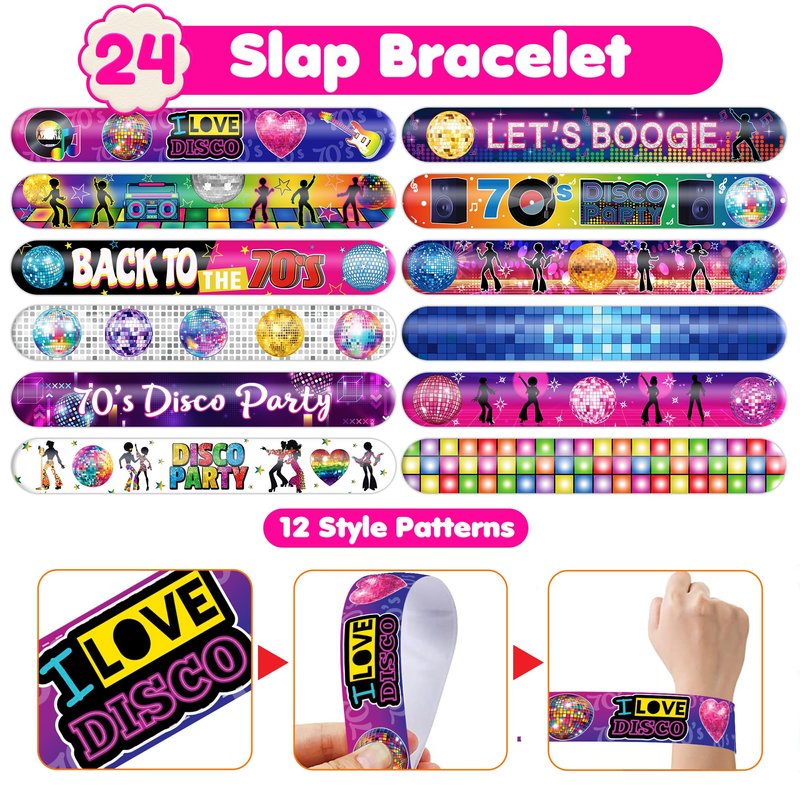 - š„³ćDELIGHTFUL 70s DISCO PARTY FAVORS BUNDLEć: Get ready for laughter with our set of 24 temporary tattoo stickers and 24 slap bracelets. Each piece showcases vibrant and adorable designs inspired by the 70s Disco theme. Perfect for both kids and adults, this bundle ensures endless fun. The bracelets measure 23.5cm x 3.3cm, providing a satisfying "slapping" experience as they effortlessly wrap around your wrist.