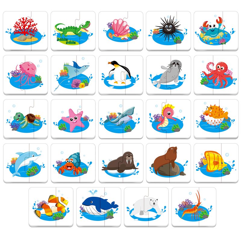 - 48 Animals: and their living environment in 24 blocks, double-sided with adorable and vivid images for easy identification. Features different background color for classify Terrestrial & Marine animal. Furthermore, puzzle pieces belong to different animals will not be matched so the kids would find the mistake and fix it.
