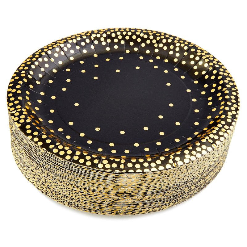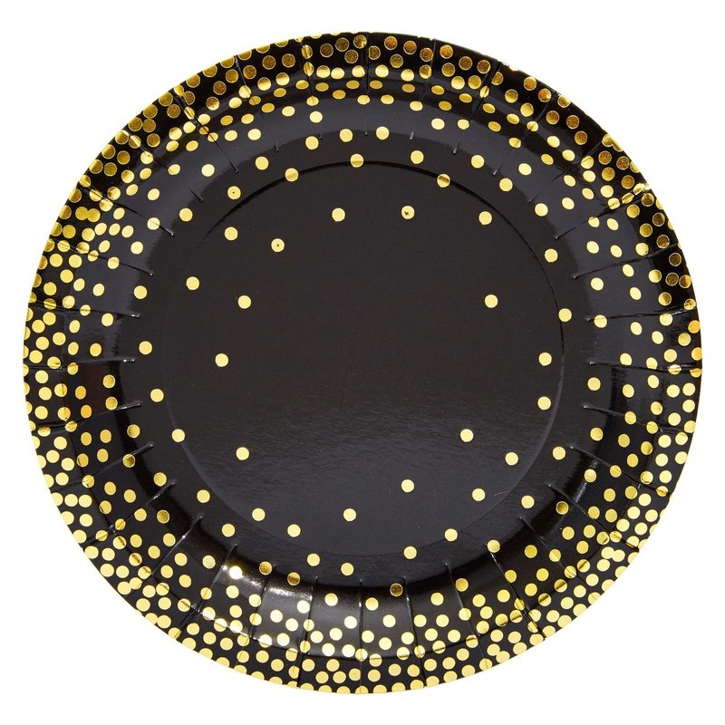 - Black with Gold Foil Dots: These black and gold birthday plates feature gold foil dots on a black background, perfect for birthday parties, anniversaries, wedding showers, and graduations