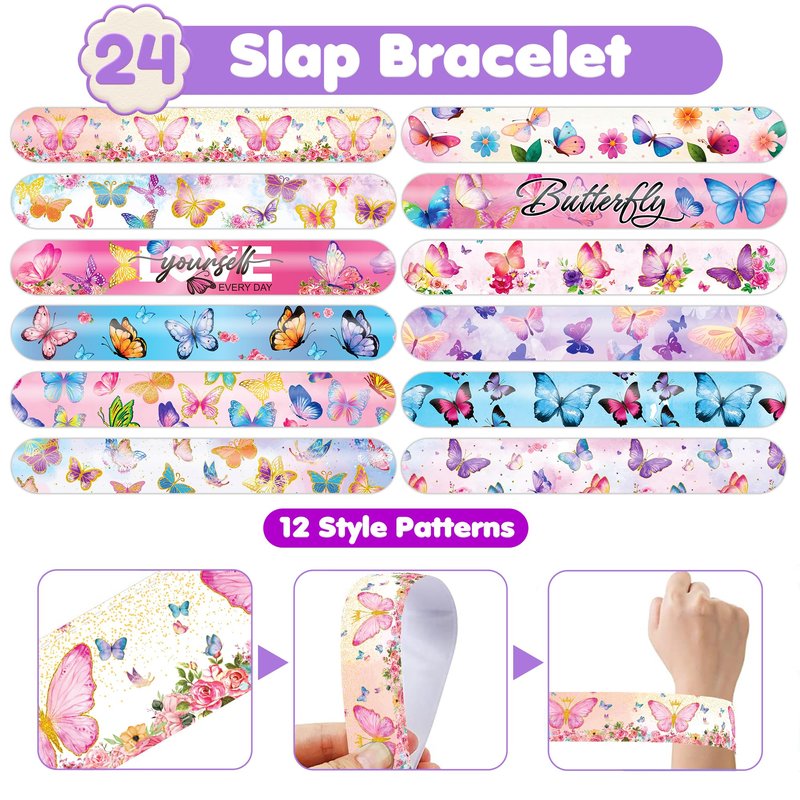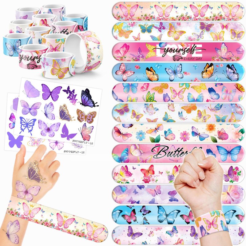 - š„³š¦ćDELIGHTFUL BUTTERFLY PARTY FAVORS BUNDLEć: Get ready for laughter with our set of 24 temporary tattoo stickers and 24 slap bracelets. Each piece showcases vibrant and adorable designs inspired by the BUTTERFLY, Purple, Pink theme. Perfect for both kids and adults, this bundle ensures endless fun. The bracelets measure 23.5cm x 3.3cm, providing a satisfying "slapping" experience as they effortlessly wrap around your wrist.