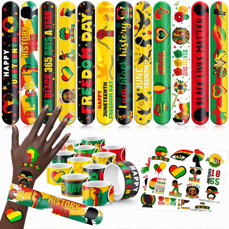 - šćPERFECT GIFT FOR JUNETEENTH ENTHUSIASTSć: Our Juneteenth Temporary Tattoos and Slap Bracelets are the perfect gift for individuals celebrating Juneteenth, from young enthusiasts to seasoned celebrators. Suitable for any Juneteenth event, they offer an affordable and spirited option. Whether for community gatherings, cultural festivals, or as a thoughtful gesture, this Juneteenth themed collection adds a fashionable and celebratory element to anyone's accessory collection, invoking joy and cherished memories.