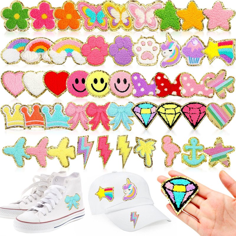 48 Pcs Iron on Patches Self Adhesive Chenille Patches for Backpacks Applique Patches Rainbow Heart Smile Face Star Flower Paw Embroidered Patch for Clothing Fabric Jackets Jeans Repair (Cute Style)