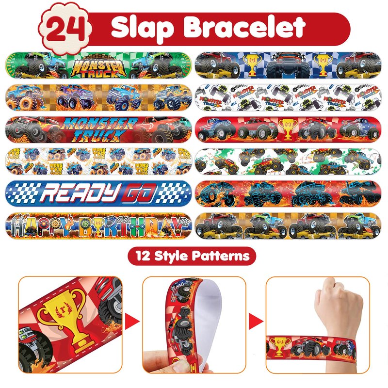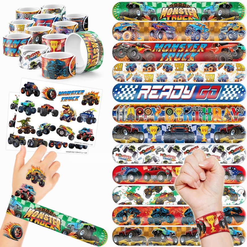 - šćPERFECT GIFT FOR MONSTER TRUCK ENTHUSIASTSć: Our Monster Truck Temporary Tattoos and Slap Bracelets are the perfect gift for people of all ages, from kids to adults. Suitable for any occasion, they offer an affordable and delightful option. Whether for school events, birthdays, or stocking stuffers, this Monster Truck themed collection adds a fashionable and nostalgic element to anyone's accessory collection, invoking happiness and cherished memories.