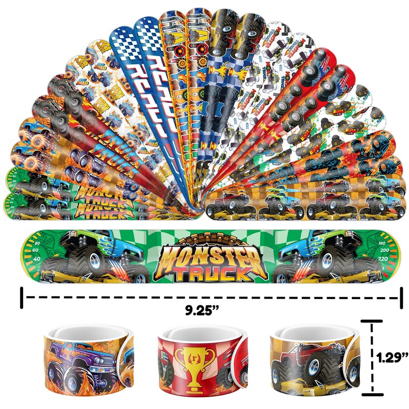 - šćEFFORTLESSLY STYLISHć: Embrace the simplicity and trendiness of wearing our slap bracelets. With just a gentle "slap," they wrap around your wrist effortlessly, creating a comfortable and stylish look. Lightweight and comfortable for extended wear, they're perfect for parties, special occasions, or everyday fashion. These accessories bring a playful charm to any gathering, capturing the joyful spirit of the Monster Truck theme. Let the festivities begin!