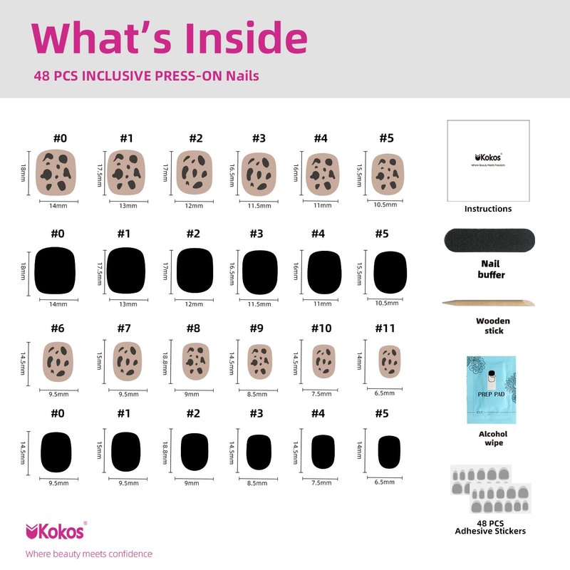 48 PCS Press On Nails, Short Square Leopard Print Contrast Fake Nails, ABS Natural Fit, Reusable Stick On Nails in 12 Sizes-Soft Gel Fake Nails Kit, Salon-quality, Brown and Black, Wild West