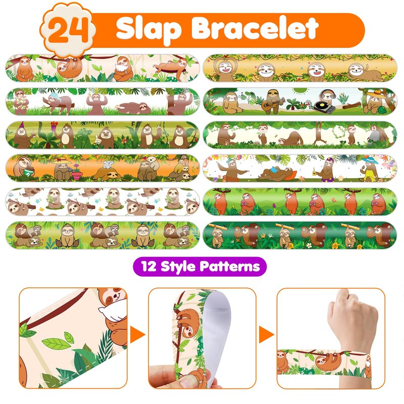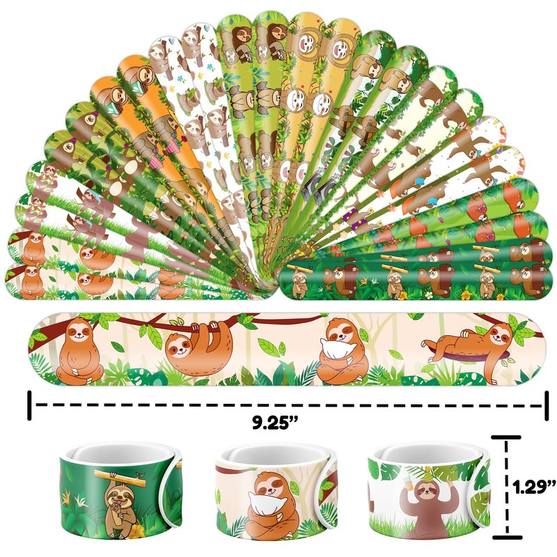 - š„³š¦„ćDELIGHTFUL SLOTH PARTY FAVORS BUNDLEć: Get ready for laughter with our set of 24 temporary tattoo stickers and 24 slap bracelets. Each piece showcases vibrant and adorable designs inspired by the SLOTH, Animal theme. Perfect for both kids and adults, this bundle ensures endless fun. The bracelets measure 23.5cm x 3.3cm, providing a satisfying "slapping" experience as they effortlessly wrap around your wrist.