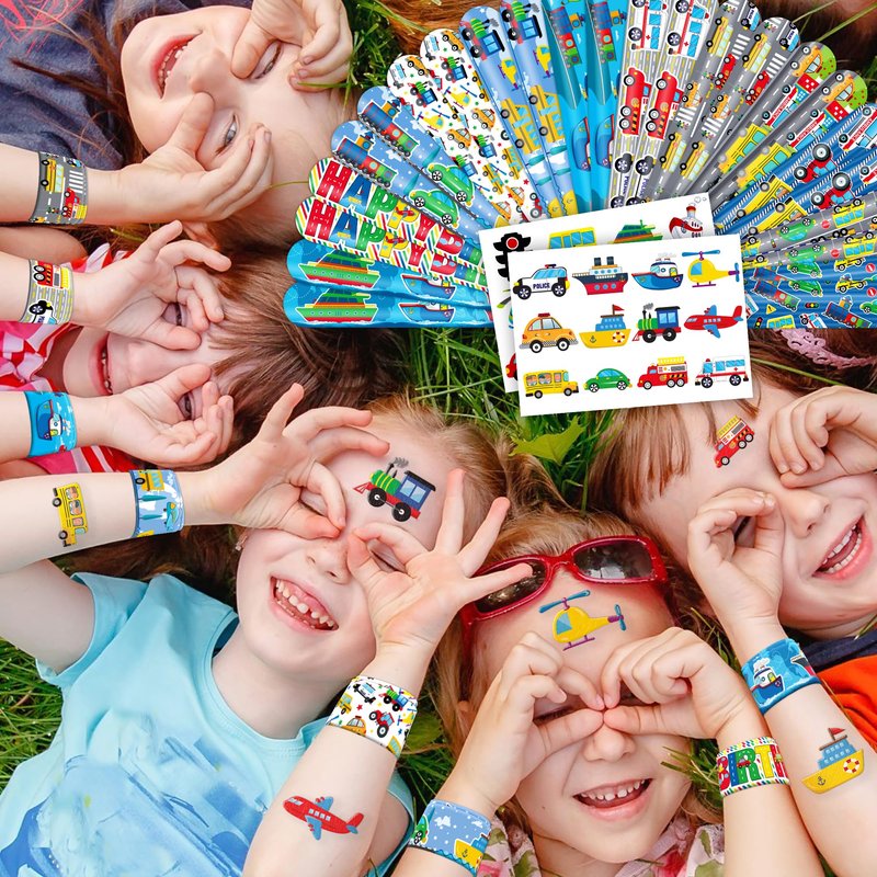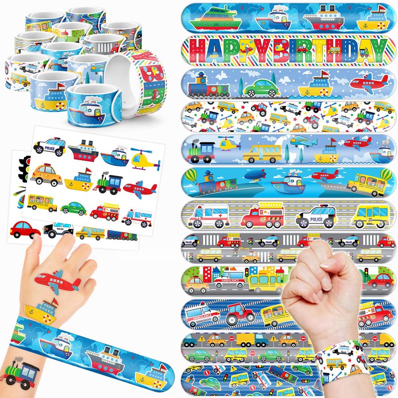 š„³š¢ćDELIGHTFUL TRANSPORTATION PARTY FAVORS BUNDLEć: Get ready for laughter with our set of 24 temporary tattoo stickers and 24 slap bracelets. Each piece showcases vibrant and adorable designs inspired by the TRANSPORTATION, Vehicles theme. Perfect for both kids and adults, this bundle ensures endless fun. The bracelets measure 23.5cm x 3.3cm, providing a satisfying "slapping" experience as they effortlessly wrap around your wrist. šæćDURABLE AND COMFORTABLEć: Constructed from high-quality materials, our slap bracelets are built to withstand wear and tear. The sturdy metal core is encased in soft PVC, ensuring safety, comfort, and longevity. With a smooth surface and no sharp edges, these bracelets offer a gentle and enjoyable feeling on your skin. Designed for daily use, they maintain their vivid colors and shape, adding a charming and nostalgic touch to your accessory collection. šćEFFORTLESSLY STYLISHć: Embrace the simplicity and trendiness of wearing our slap bracelets. With just a gentle "slap," they wrap around your wrist effortlessly, creating a comfortable and stylish look. Lightweight and comfortable for extended wear, they're perfect for parties, special occasions, or everyday fashion. These accessories bring a playful charm to any gathering, capturing the joyful spirit of the TRANSPORTATION theme. Let the festivities begin! šćVERSATILE AND PORTABLEć: Take the fun with you wherever you go with our versatile slap bracelets. Their compact and lightweight design allows for easy carrying in your pocket, purse, or backpack. Whether at school, work, or social gatherings, wearing them instantly adds a lively and fashionable touch to your outfit. With their playful and nostalgic appeal, these bracelets are sure to attract attention and bring smiles wherever you venture. Get ready! šćPERFECT GIFT FOR TIE-DYE ENTHUSIASTSć: Our TRANSPORTATION Temporary Tattoos and Slap Bracelets are the perfect gift for people of all ages, from kids to adults. Suitable for any occasion, they offer an affordable and delightful option. Whether for school events, birthdays, or stocking stuffers, this TRANSPORTATION themed collection adds a fashionable and nostalgic element to anyone's accessory collection, invoking happiness and cherished memories.