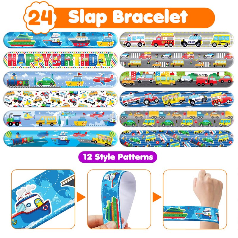 - šćEFFORTLESSLY STYLISHć: Embrace the simplicity and trendiness of wearing our slap bracelets. With just a gentle "slap," they wrap around your wrist effortlessly, creating a comfortable and stylish look. Lightweight and comfortable for extended wear, they're perfect for parties, special occasions, or everyday fashion. These accessories bring a playful charm to any gathering, capturing the joyful spirit of the TRANSPORTATION theme. Let the festivities begin!