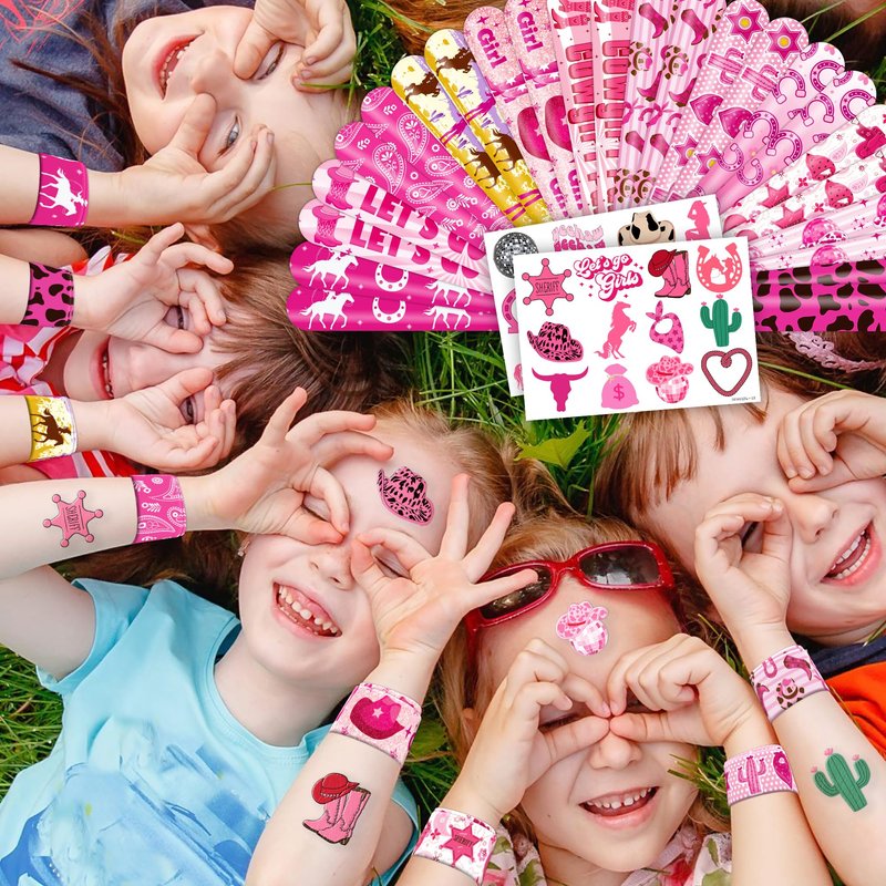 - šćPERFECT GIFT FOR WESTERN COWGIRL ENTHUSIASTSć: Our Western Cowgirl Temporary Tattoos and Slap Bracelets are the perfect gift for people of all ages, from kids to adults. Suitable for any occasion, they offer an affordable and delightful option. Whether for school events, birthdays, or stocking stuffers, this Western Cowgirl themed collection adds a fashionable and nostalgic element to anyone's accessory collection, invoking happiness and cherished memories.