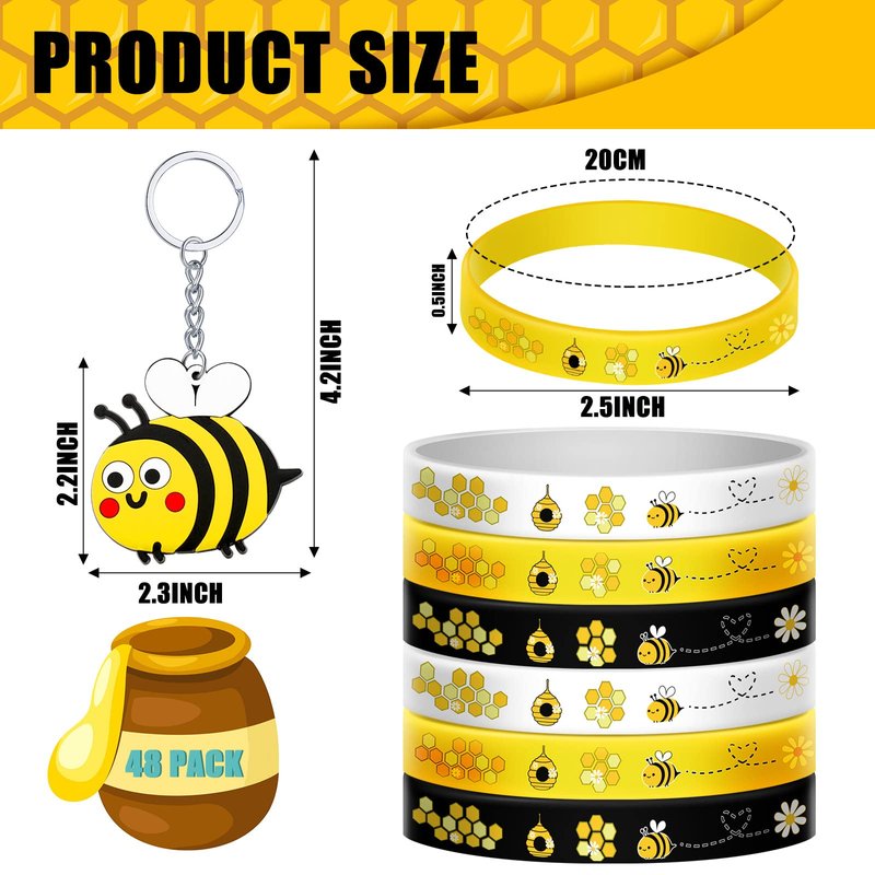 48 Pieces Cute Bee Keychain Bee Rubber Bracelets Bee Birthday Party Favors Honey Bee Silicone Wristband Bee Party Decorations for Birthday Supplies