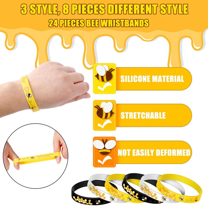 Features:These bee decorations are ideal daily ornaments, the sweet and bright color can match a lot of your outfits, lovely and pretty, making you seem energetic and attractive in the crowd.You can send these bee party favors to those people who love these decorative accessories, such as family members, friends, relatives, neighbors and so on, showing your love and care about them. They will be grateful of your kindness, and your relationships will be promoted.Specifications:Material:Wristband: siliconeKeychain: alloy, silicone Color: as shown in the picturesSize: Wristband: approx. 2.5 inches in diameter, 0.5 inch in width, and 7.9 inches in circumferenceKeychain: as shown in the picturesPackage includes:24 x Wristbands24 x KeychainsNotes:Manual measurement, please allow slight errors on size.The color may exist a slight difference due to different screen displays.
