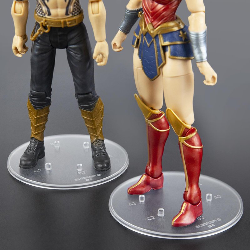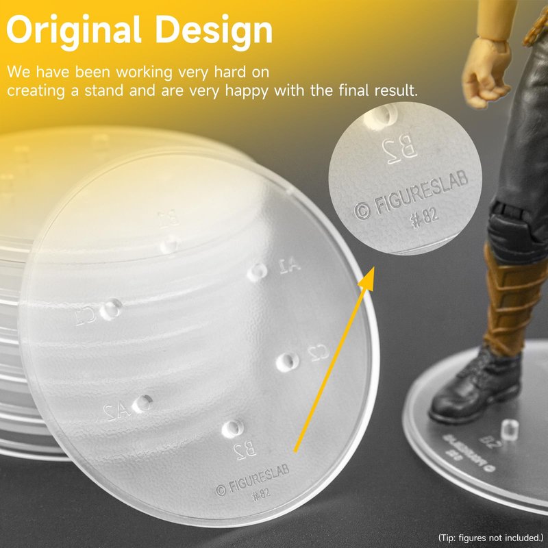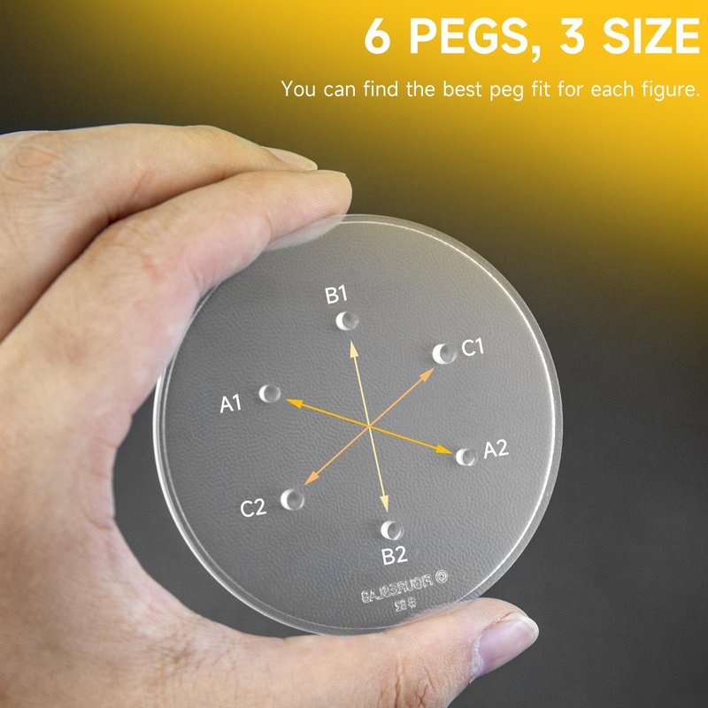 - UPGRADE DESIGN STANDS - Compared to the previous square stand base, this new circle stands design with 3 different peg size option but adding 6 pegs(for example: Peg A1 matching A2; Peg B1 matching B2; Peg C1 matching C2). The circle shape let your figures stand more stable and let them look more elegant when displaying, excellent items to keep unbalanced action figures standing to put a figure in a walking pose.