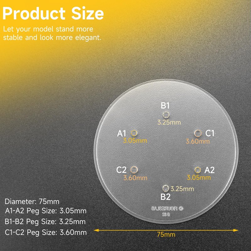 Base size: display stand diameter measures approx. 7.5cm/ 3inch; 3.5mm/ 0.13inch in thickness.