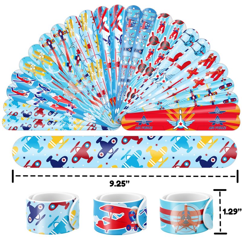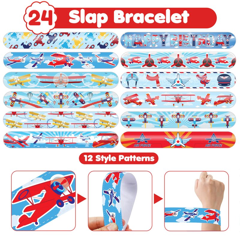 - 🛩️【AIRPLANE PARTY FAVORS DELIGHTFUL BUNDLE】: Prepare for giggles with our set of 24 slap bracelets and 24 temporary tattoo stickers. Each piece features a lively and adorable design inspired by the AIRPLANE theme. Perfect for kids and adults alike, this bundle promises boundless enjoyment. The bracelets measure 23.5cm x 3.3cm, providing a gratifying "slapping" experience as they effortlessly encircle your wrist.